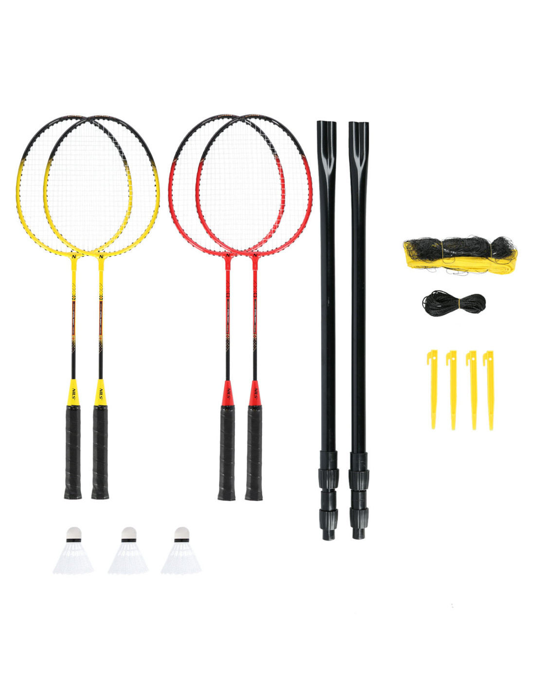Комплектът включва четири ракети, комплект от три волани, две телескопични щеки и найлонова мрежа. Това оборудване предоставя на потребителя всичко необходимо, за да започне тренировка. Освен това целият комплект е опакован в защитен калъф за лесно транспортиране.