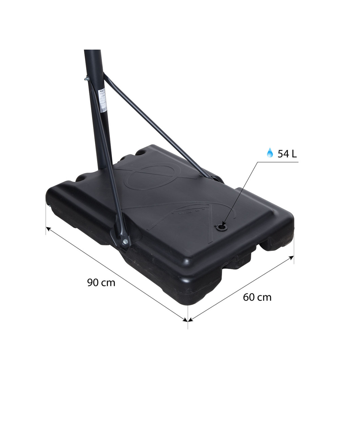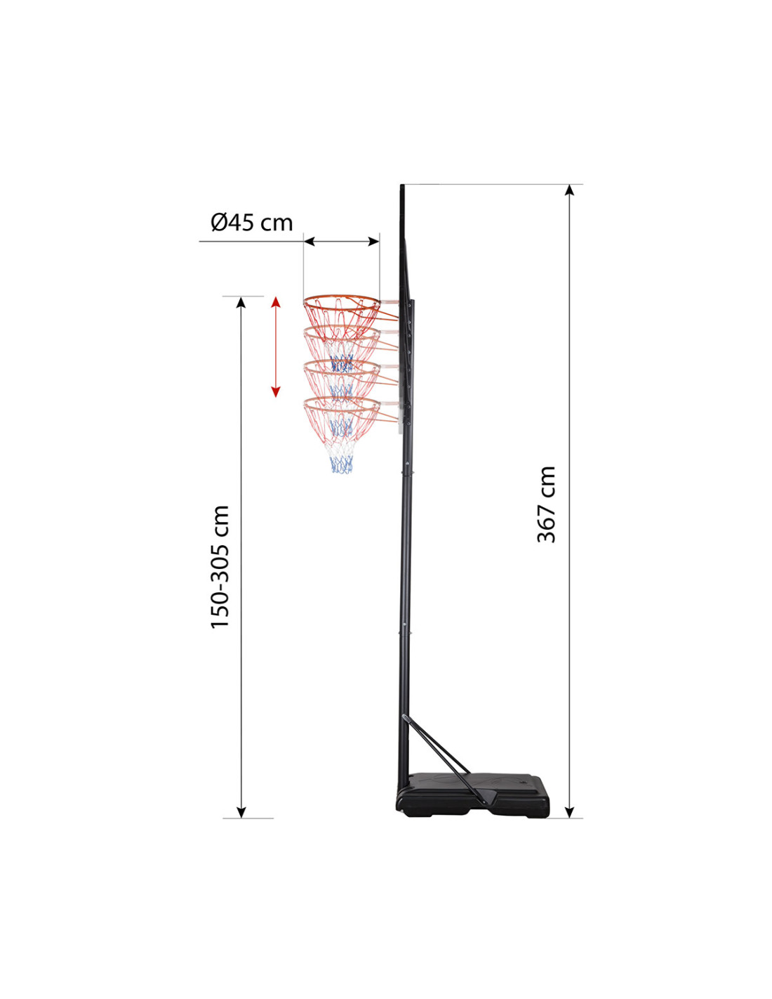ZDK319E е мобилен, свободностоящ баскетболен кош, идеален за индивидуално обучение или игра. Регулируемата височина позволява обръчът да се адаптира към размера и възможностите на потребителя. Максималната височина на джантата е 3,05м. Продуктите на NILS се характеризират с висококачествени материали. Таблата е изработена от изключително издръжлив PE материал. В комбинация със стоманената джанта те гарантират дълготрайна употреба. Транспортните колела, монтирани върху стабилната 54-литрова пълна с вода основа, осигуряват пълна мобилност, като същевременно поддържат стабилността на продукта. Всеки елемент от конструкцията е устойчив на атмосферни влияния.
