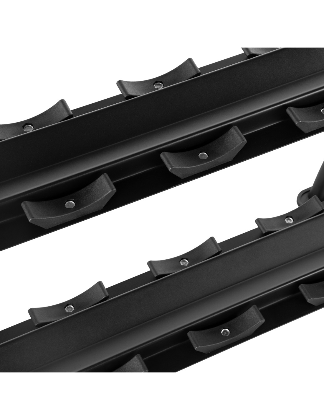 Стойката разполага с предпазен ръб за предотвратяване на случайно падане на дъмбелите. Здравата конструкция осигурява стабилност и предпазва стойката от преобръщане, дори при пълно натоварване.