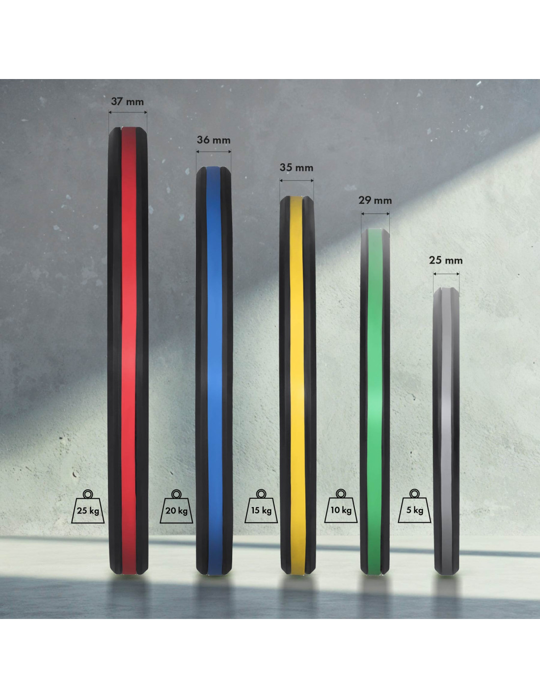 Благодарение на различните тежести, включени в комплекта, TOG ви позволява постепенно да увеличавате натоварването във вашата тренировка. Цветовете на плочите, които отговарят на международните стандарти – 2 x 5 kg (сиво), 2 x 10 kg (зелено), 2 x 15 kg (жълто), 2 x 20 kg (синьо) и 2 x 25 kg (червено) – и ясните маркировки за тегло ви позволяват бързо да изберете правилното натоварване. Това решение е идеално за изграждане на сила, издръжливост и подобряване на техниката при упражнения като клекове, мъртва тяга и преси от лег.