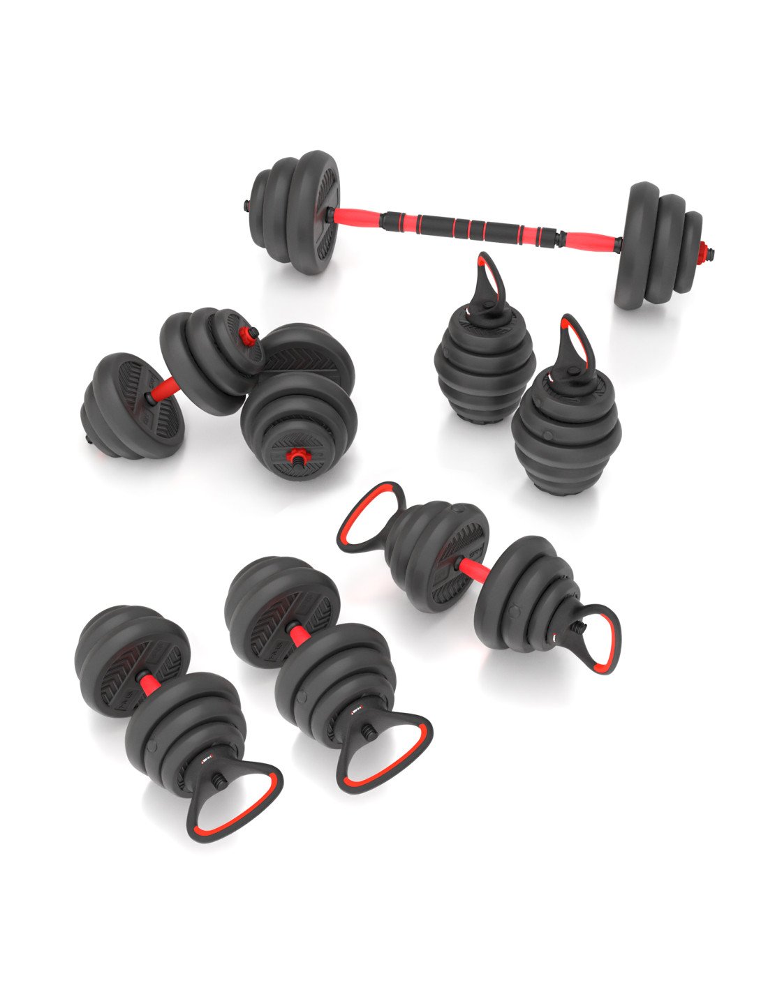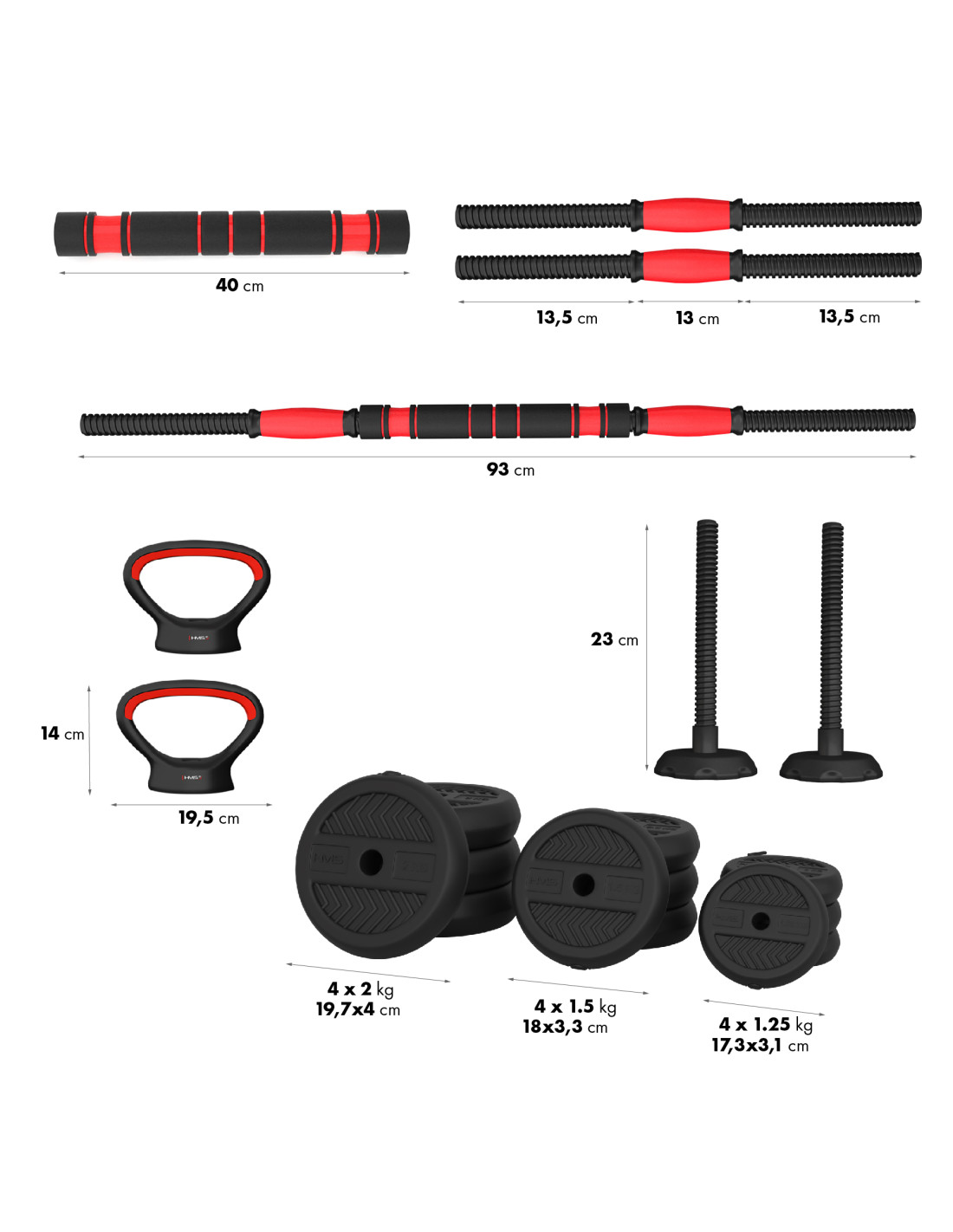SGN 6-in-1 ist ein revolutionäres Produkt von der Marke HMS, die die Durchführung verschiedener Kraftübungen mit einem Set ermöglicht. SGN 6-in-1 besteht aus zwölf Hantelscheiben, zwei kurzen Hantelstangen, einem Verbindungselement für Hantelstangen, zwei Griffen, zwei Kettlebell-Ständern und Verschlüssen. Mit diesem Set bekommen Sie folgende Produkte: