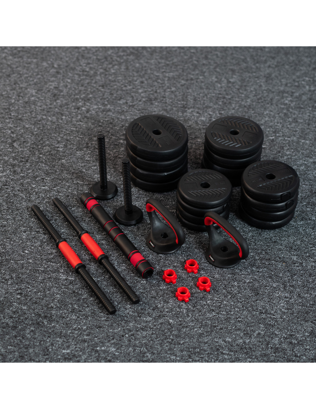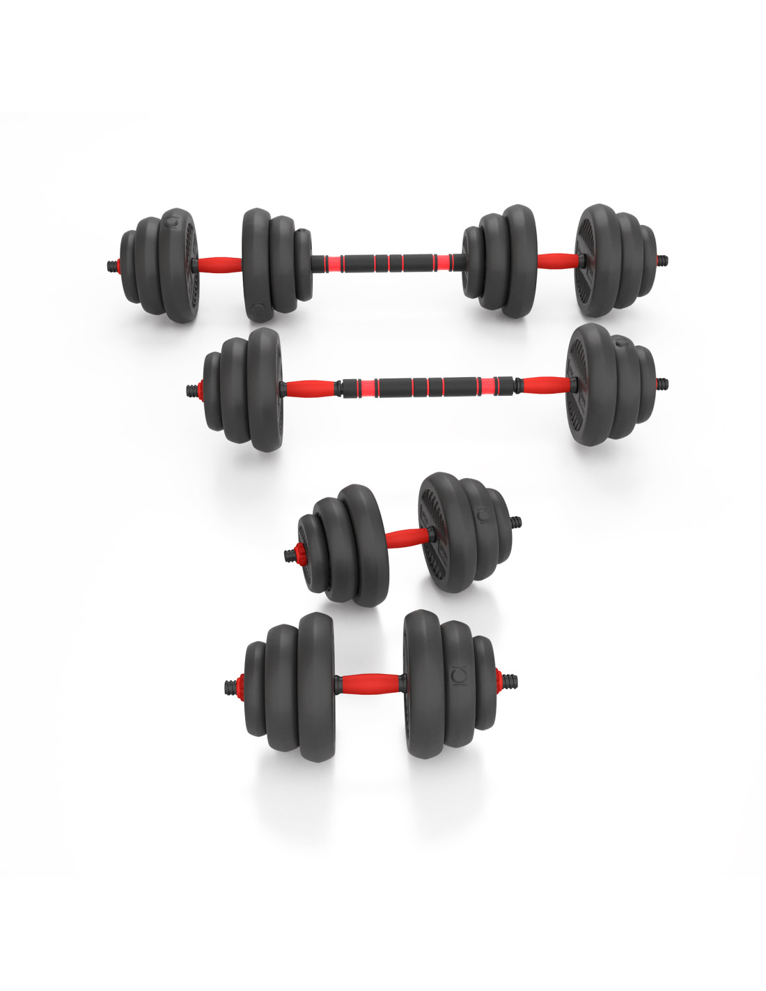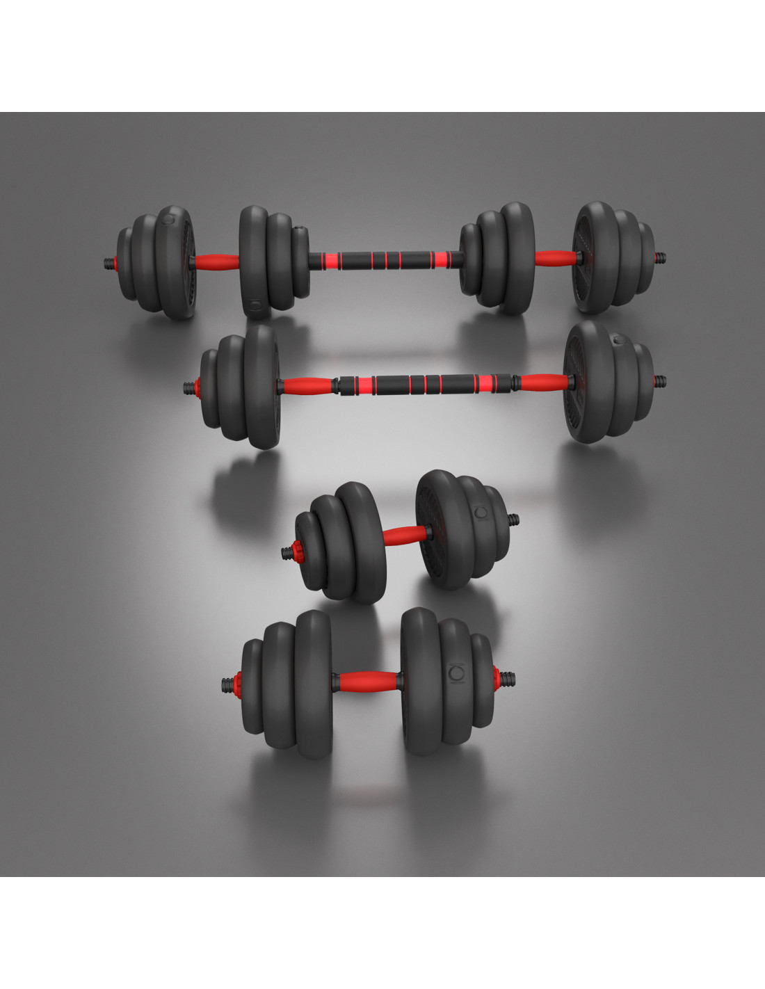 Zwei Kurzhanteln : Befestigen Sie auf der Langhantel die Hantelscheiben beidseitig und ziehen Sie die Verschlüsse fest an. Zwei Kurzhanteln sind perfekt für Übungen für den Aufbau der folgenden Muskeln: Bizeps, Trizeps, Schultern, Brust oder Rücken. Ein Training mit Kurzhanteln ist vielseitig und ermöglicht, jede Körperpartie zu trainieren und alle grundlegende Bewegungsmuster nachzuahmen. Sie können auch Kraft und Ausdauer verbessern.