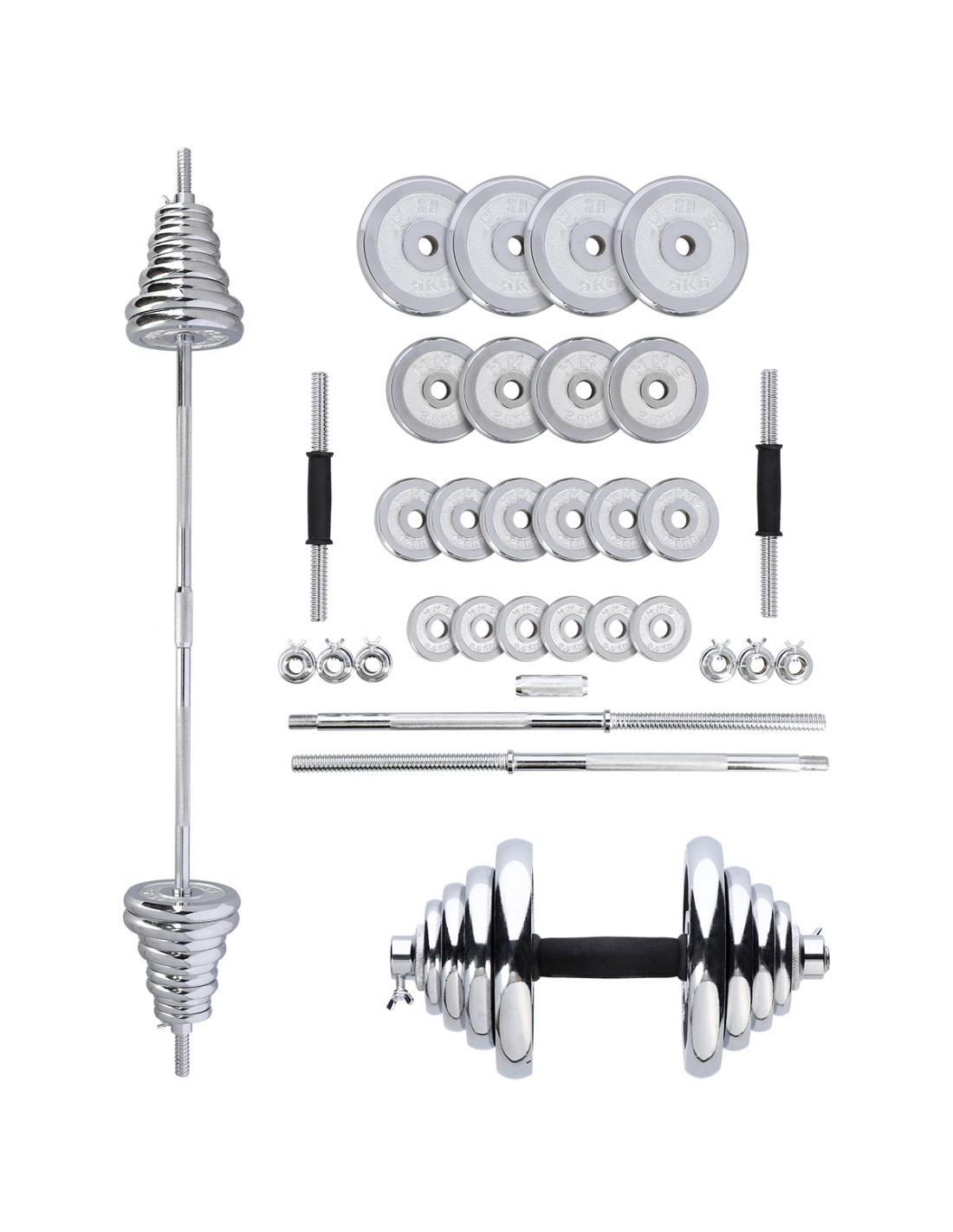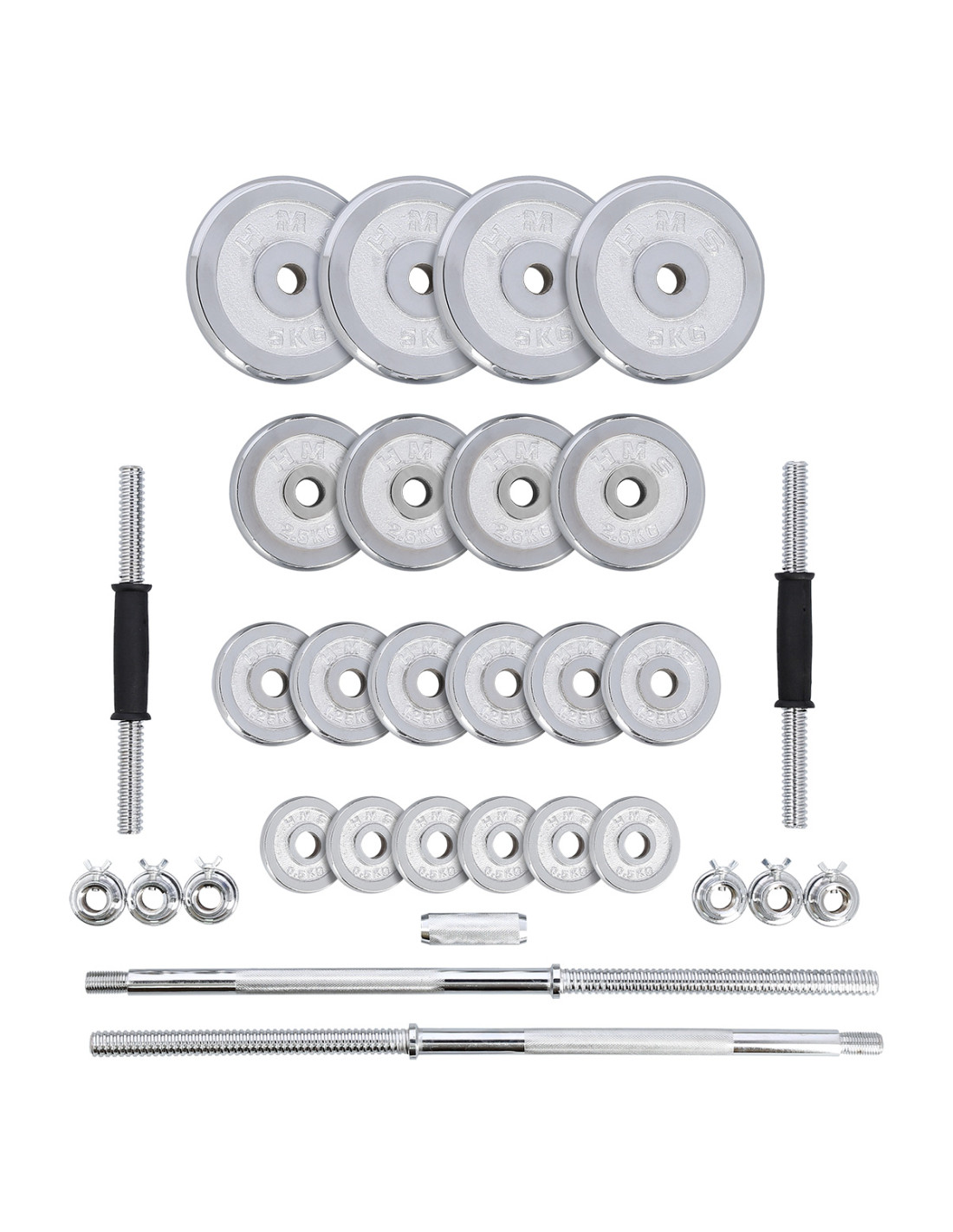 Висококачествената хромирана стомана осигурява висока здравина на този комплект, което ви позволява да го използвате дълго време. Ключалките и идеално съчетаният диаметър на отвора в плочите за тежести улесняват бързата смяна на плочите за тежести. В същото време това ви позволява да натиснете здраво плочите с тежести и да ги задържите на място. Бравите са с резба и допълнително подсилени с винт. Това предотвратява изплъзването на плочите с тежести по време на тренировка.