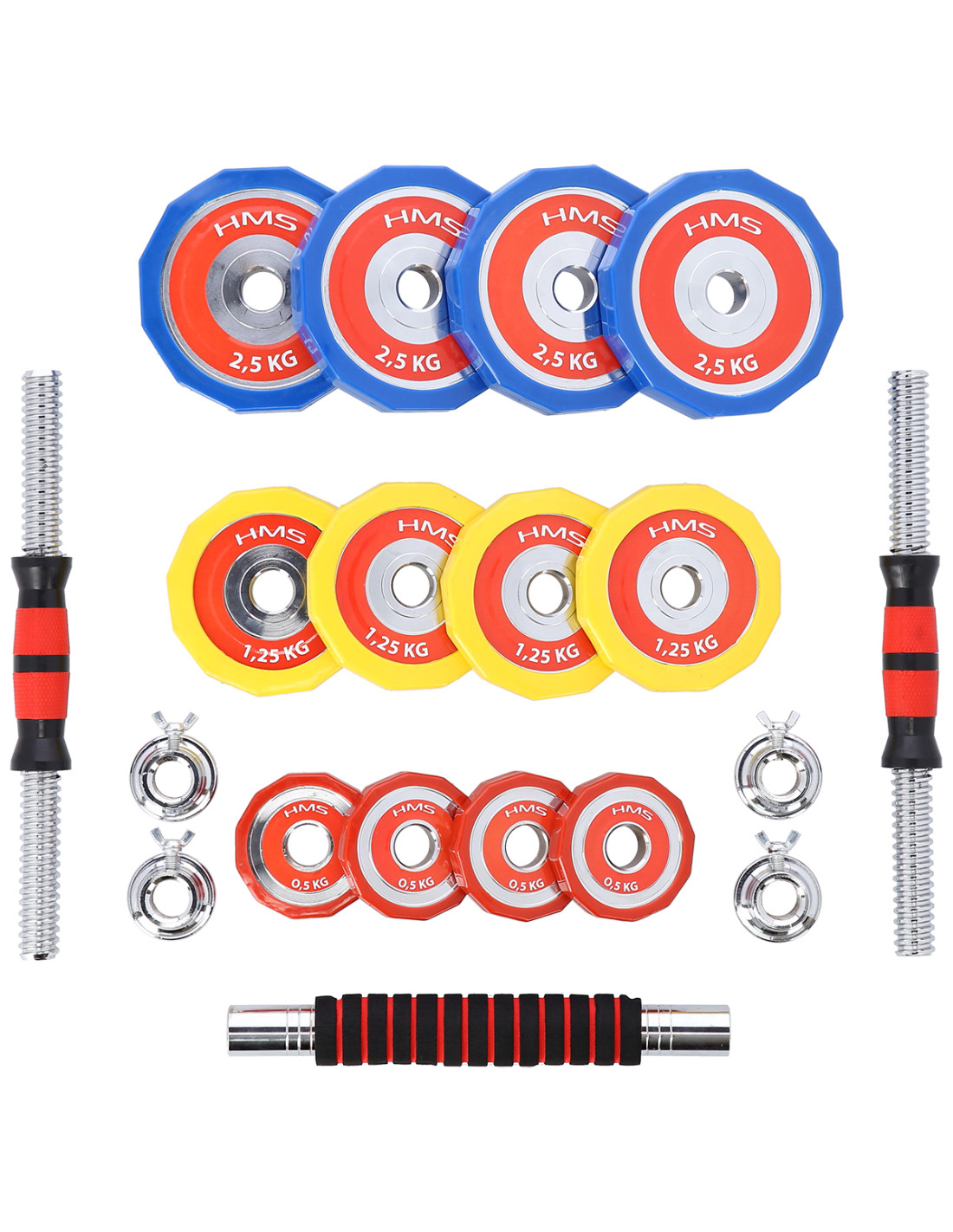 Дъмбелите със сменяеми плочи за тежести са класически и основен елемент от всяка домашна фитнес зала. Този комплект SKC20 HMS е задължителен за вашата фитнес зала. Разполага с два хромирани стоманени дъмбела. Тези дъмбели могат да се комбинират, за да се създаде щанга.