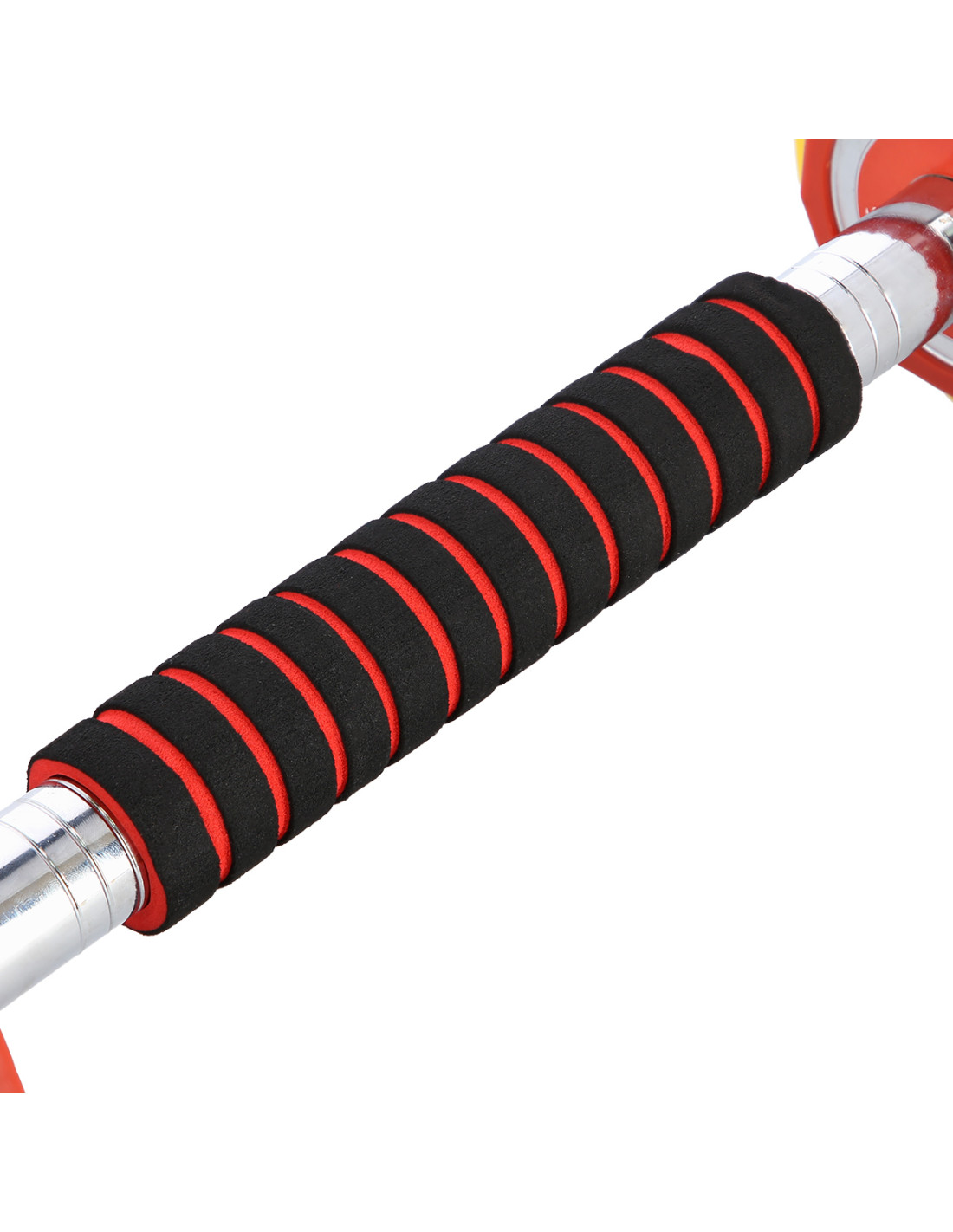 Висококачествената хромирана стомана гарантира висока устойчивост и издръжливост. Стоманата също е покрита с PVC, което осигурява допълнителна защита и абсорбира потенциални удари. Ключалките и идеално съчетаният диаметър на отвора в плочите за тежести улесняват бързата смяна на плочите. В същото време това ви позволява да натиснете здраво плочите с тежести и да ги задържите на място. Бравите са с резба и допълнително подсилени с винт. Това предотвратява изплъзването на плочите с тежести по време на тренировка.