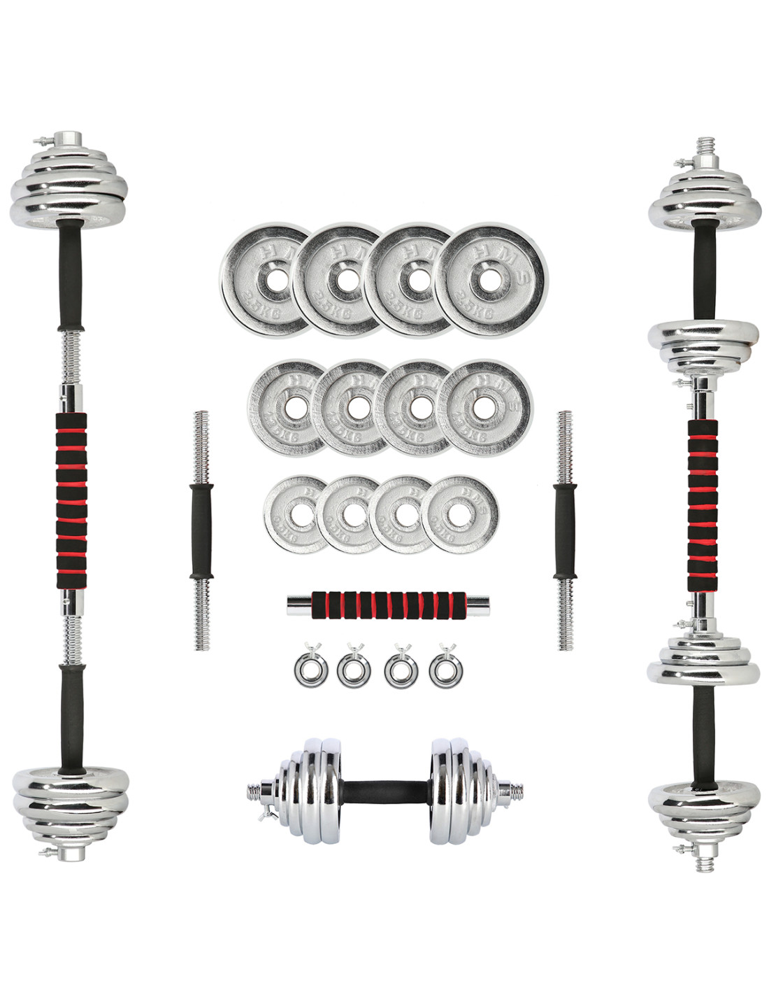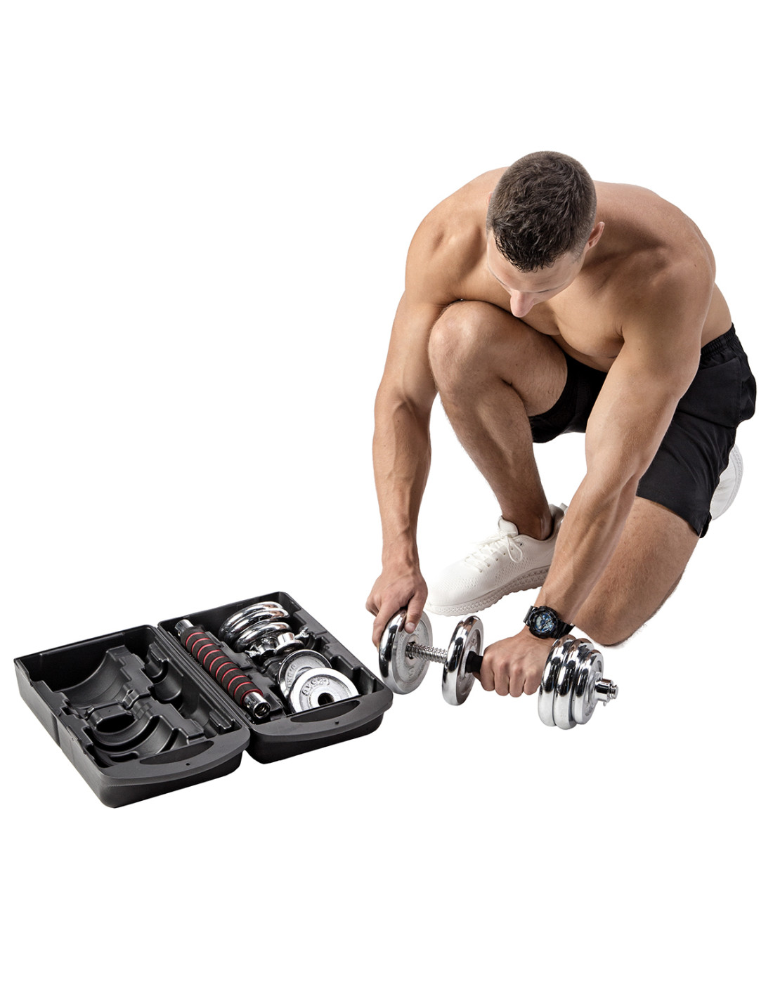 STC21 HMS е комплект хромирани дъмбели в калъф, който може да служи и като щанга.