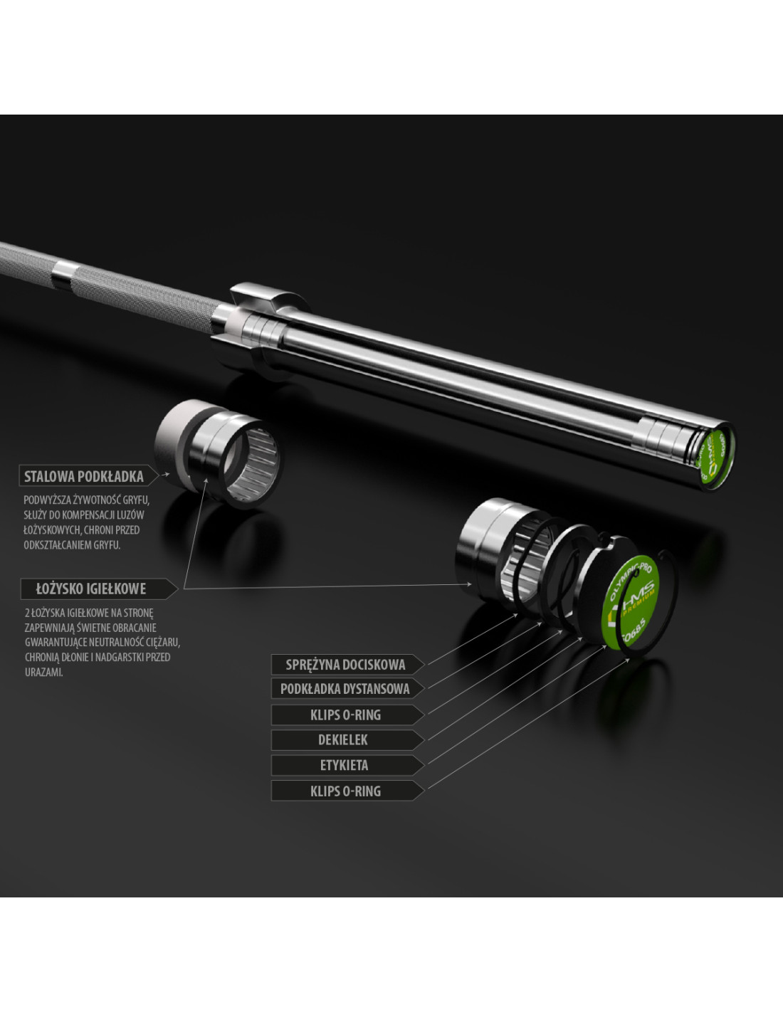 Олимпийската щанга GO685 HMS разполага с четири иглени лагера (по два от всяка страна), позволявайки на секцията с тежести да се върти плавно. Този дизайн елиминира напрежението в краищата на ролките, което в крайна сметка удължава експлоатационния живот на иглените лагери. Въпреки малкото си напречно сечение, иглените лагери предлагат висока устойчивост на вибрации и висока товароносимост. В комплекта са включени две пластмасови капачки, осигуряващи стабилно положение на товара по време на тренировка. Капачките имат гумени елементи отвътре, за да предотвратят разхлабването на товара.