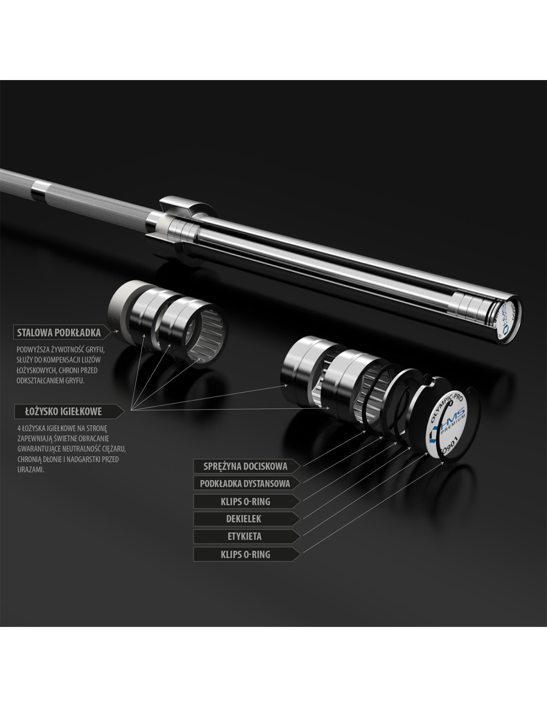 Олимпийската щанга GO901 HMS разполага с осем иглени лагера (по четири от всяка страна), позволявайки на секцията с тежести да се върти плавно. Този дизайн елиминира напрежението в краищата на ролките, което в крайна сметка удължава експлоатационния живот на иглените лагери. Въпреки малкото си напречно сечение, иглените лагери предлагат висока устойчивост на вибрации и висока товароносимост. В комплекта са включени две бързо освобождаващи се закопчалки, осигуряващи стабилна позиция на товара по време на тренировка.