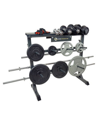 STR12 е оборудван с четири държача за щанги и седем дръжки за тежести (плочи за тежести). В горната част на багажника има място за съхранение на дъмбелите. Това поддържа вашите аксесоари организирани. Горната стойка разполага с функции за безопасност от двете страни, за да се предотврати изплъзване на дъмбелите, както и омекотяващ и защитен материал за стойката.