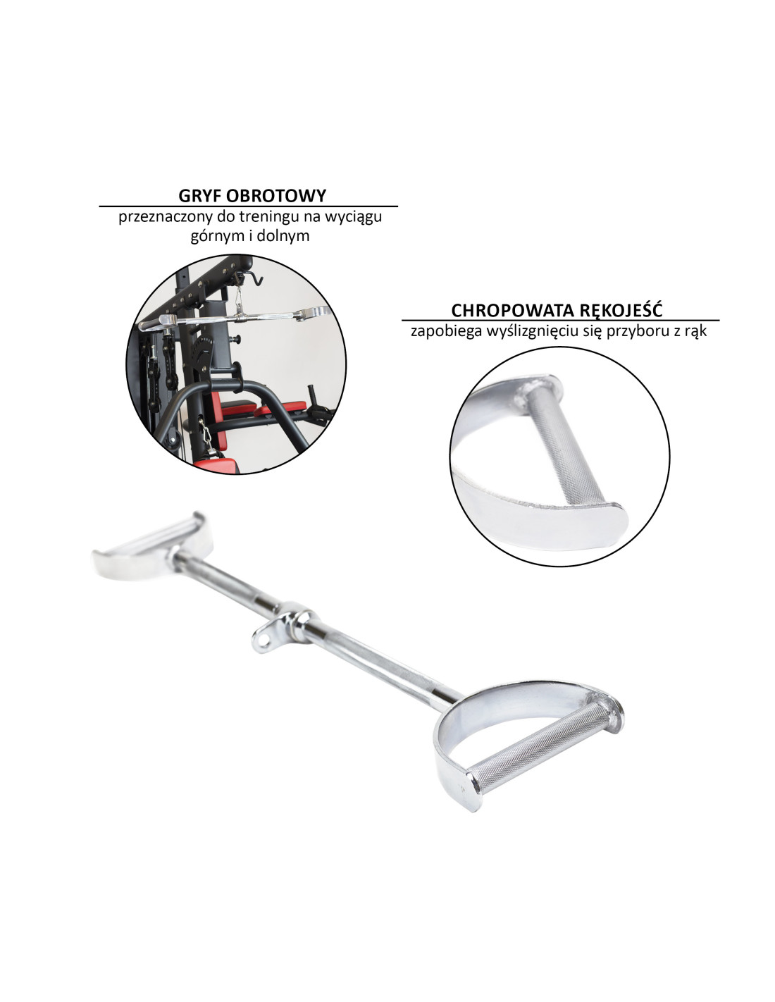 Въртящата се щанга UW16 HMS lat pulldown с ръкохватки за копита е подходяща за тренировки с lat pulldown и кабелни станции. Може да се използва за различни упражнения, насочени към различни горни мускулни групи, от малки мускулни групи (като бицепс или трицепс) до предни и средни делтоиди, latissimus dorsi и разгъвачи на гърба.