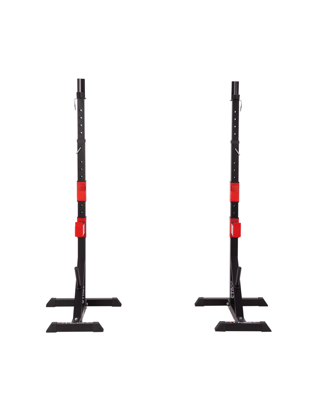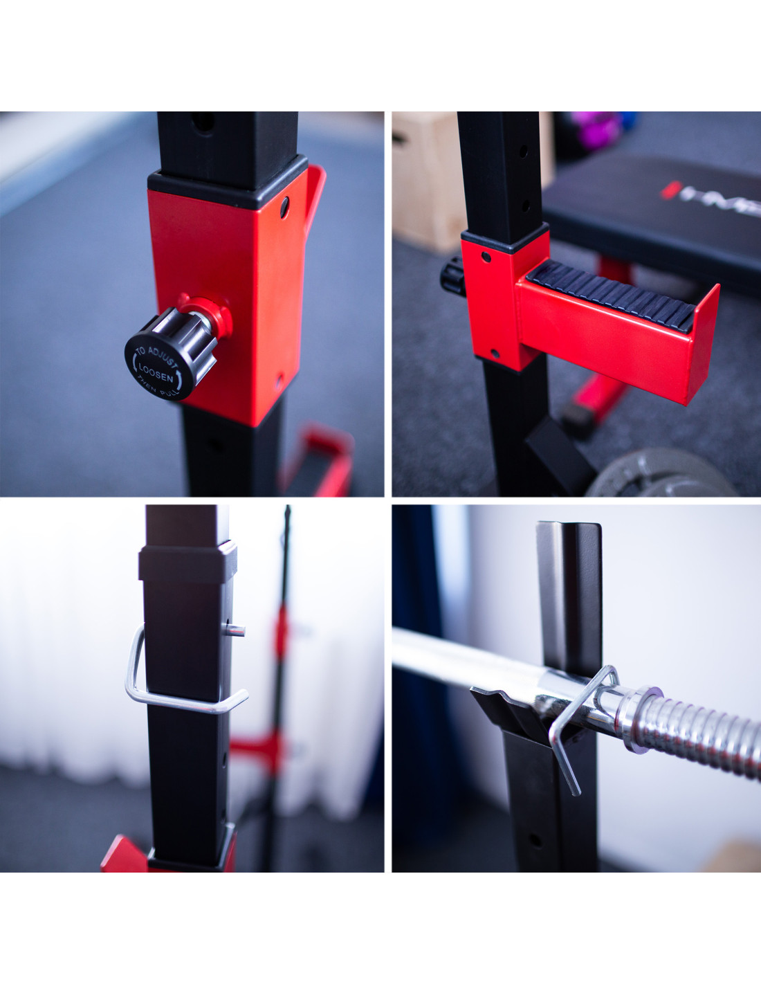 Този продукт разполага и със стойка за щанга за поставяне на щангата. Има една стойка в горната част на стойката и друга в долната част. Те са регулируеми. Куките са специално оформени, за да предпазят щангата от падане.