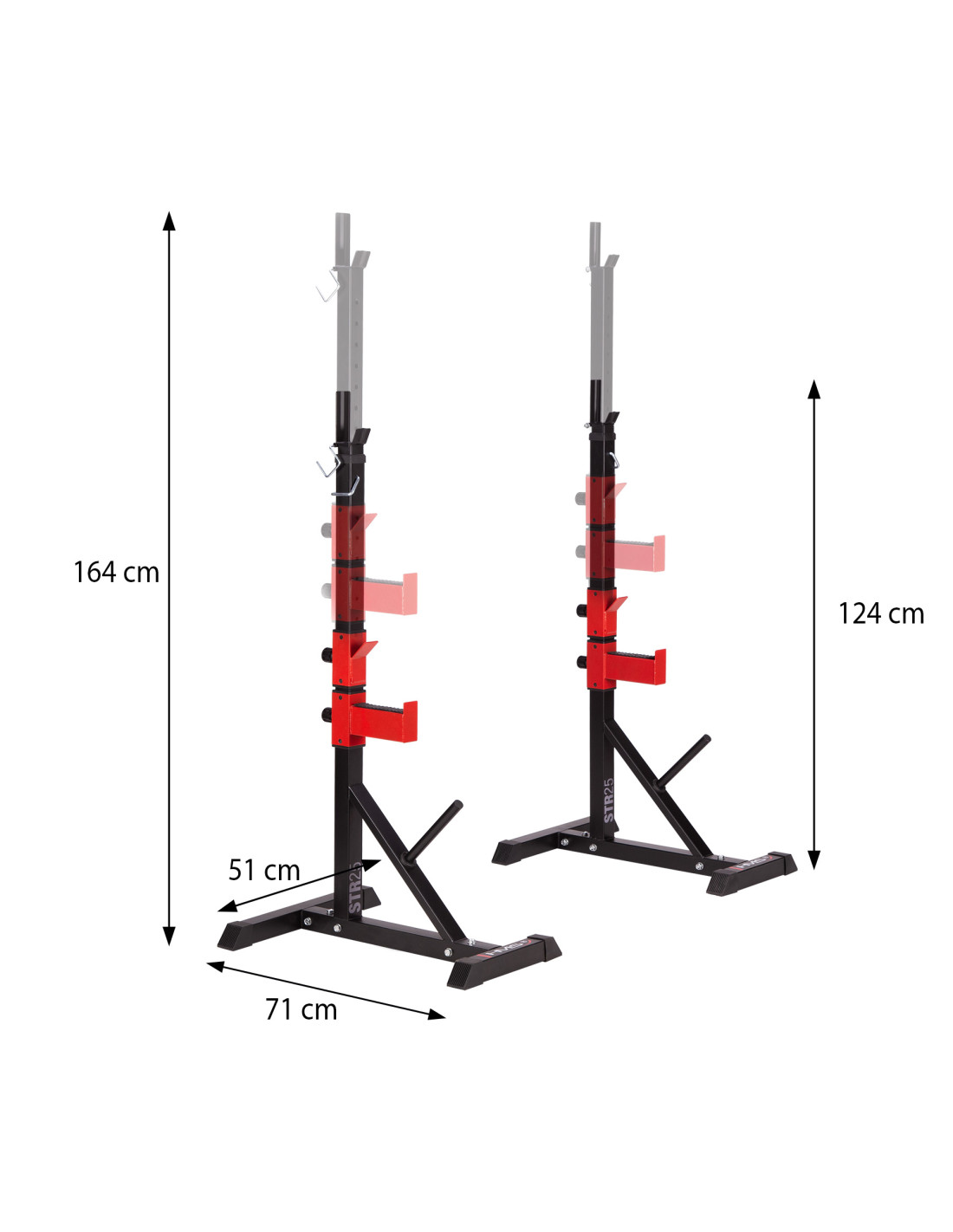 STR25 разполага с 10 нива на регулиране на височината, което ви позволява да регулирате стойката според вашата височина и упражненията, които изпълнявате. Регулирането на височината става бързо и лесно. Просто извадете копчето, изберете правилната позиция и заключете стойката. Можете да използвате тази стойка както за тренировки на пейка с тежести, така и за други видове упражнения.