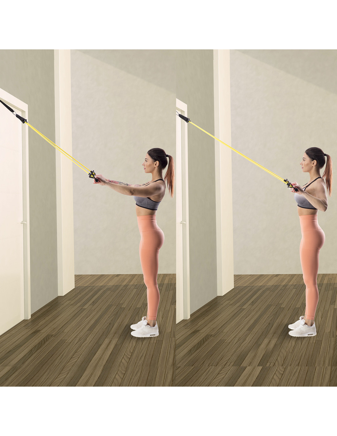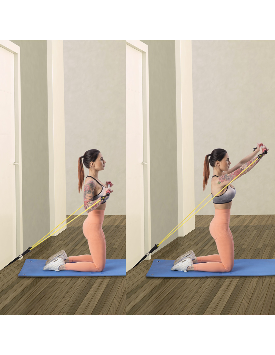 Можете да изпълнявате упражненията по два начина: можете да увиете еластичните ленти около краката си и да изпълнявате движенията с тази лента. Вторият вариант е да държите щангата с краката си и да разтегнете еластичните ленти. С допълнителната дръжка тези ленти могат да бъдат прикрепени и към вратата, разширявайки вашите възможности за упражнения.