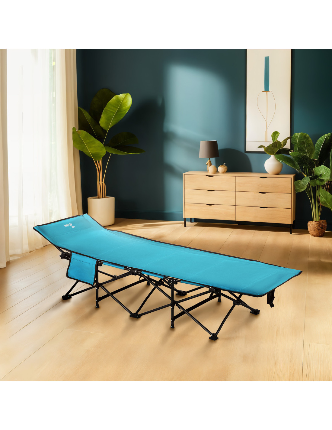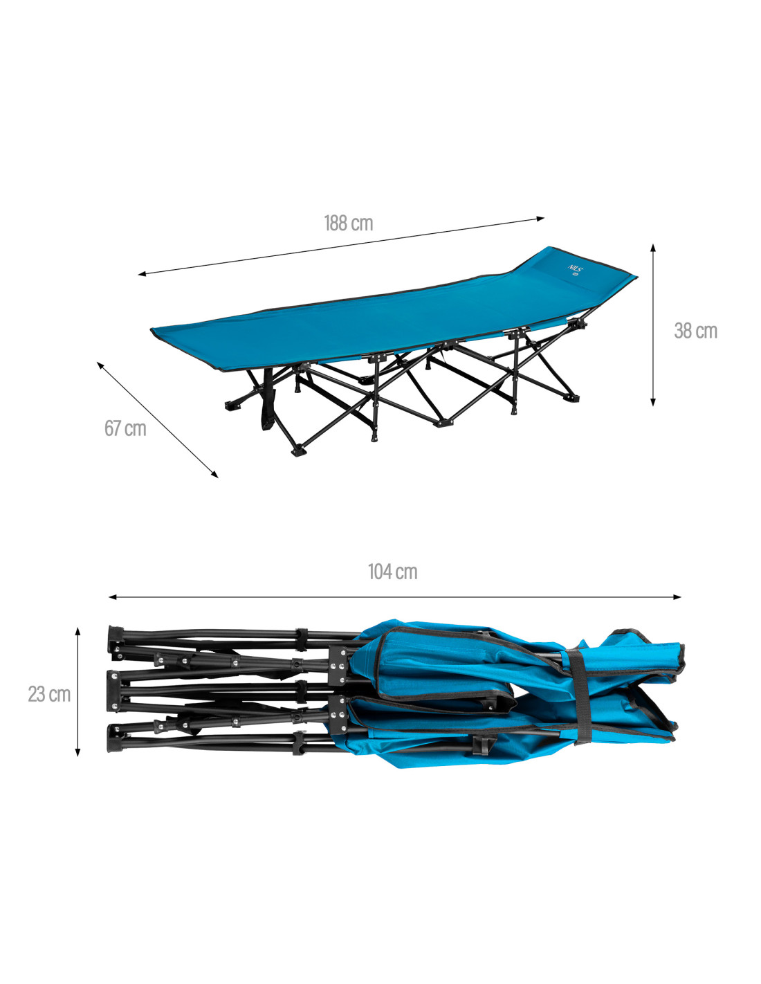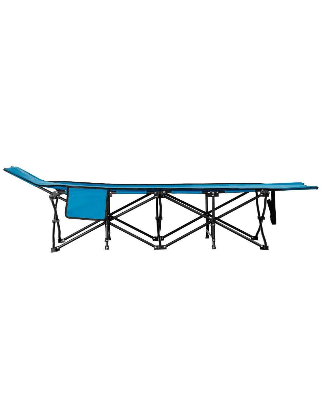 В сгънато състояние леглото заема минимално място (104 × 23 см), което го прави лесно за транспортиране и съхранение. С тегло само 6 кг е лесно за пренасяне и съхранение в колата ви. Допълнителен страничен джоб (24,5 × 14,5 cm) осигурява място за важни предмети като мобилен телефон, фенерче или книга.