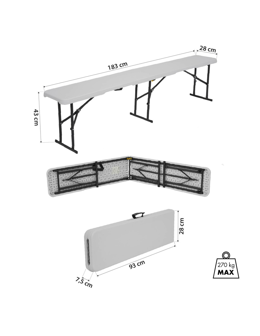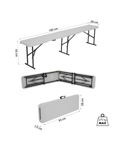 Въпреки лекото си тегло, пейката NC3404 се характеризира с изключителна стабилност и здравина. С максимална товароносимост от 270 кг, той може безопасно да се използва от няколко души наведнъж. С дължина от 183 см, той предлага много място за хората да седнат на масата, а височината му от 43 см е идеално подходящ за стандартни маси за пикник и кетъринг.