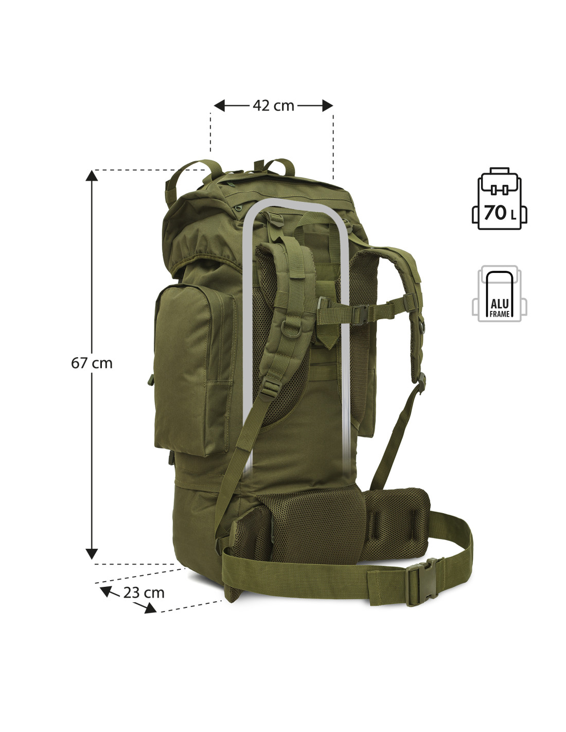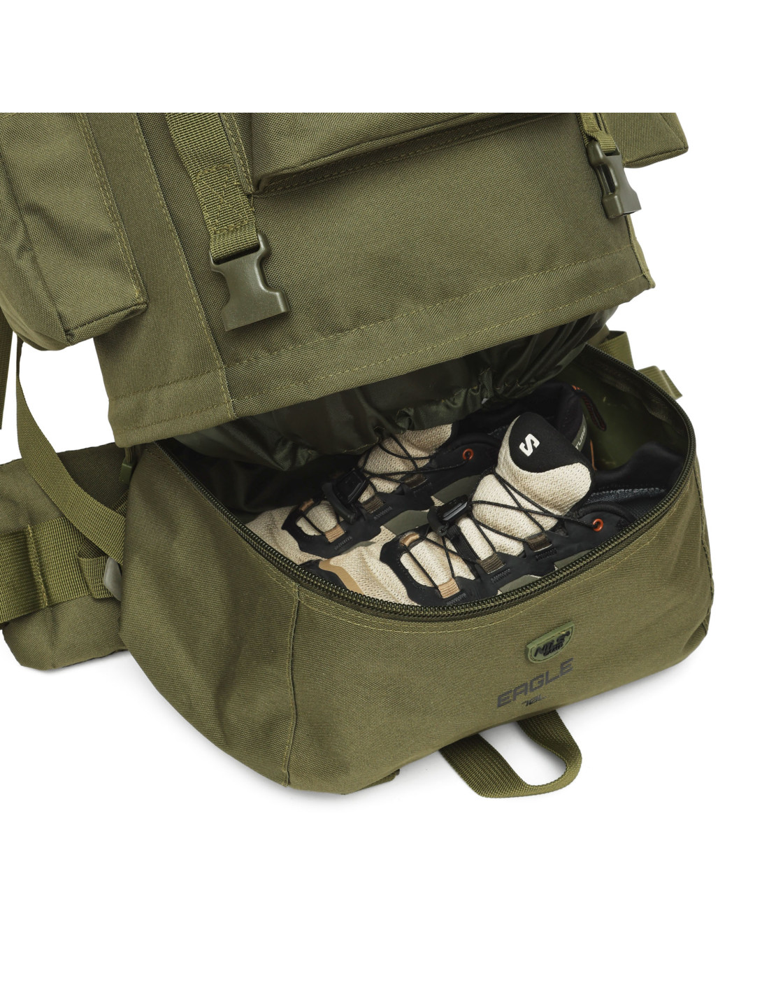 Военната раница NC3901 Eagle от NILS CAMP е чудесен избор за всеки, който цени надеждността, функционалността и готовността за употреба при всякакви условия. С впечатляващия си капацитет от 70 литра , тя предлага достатъчно място за цялото оборудване, необходимо за многодневно пътуване, от дрехи и храна до палатка и туристическа екипировка. Това е перфектният избор за любители на трекинг, бушкрафт и оцеляване, както и за всеки, който се готви за експедиции в труден планински или горски терен.