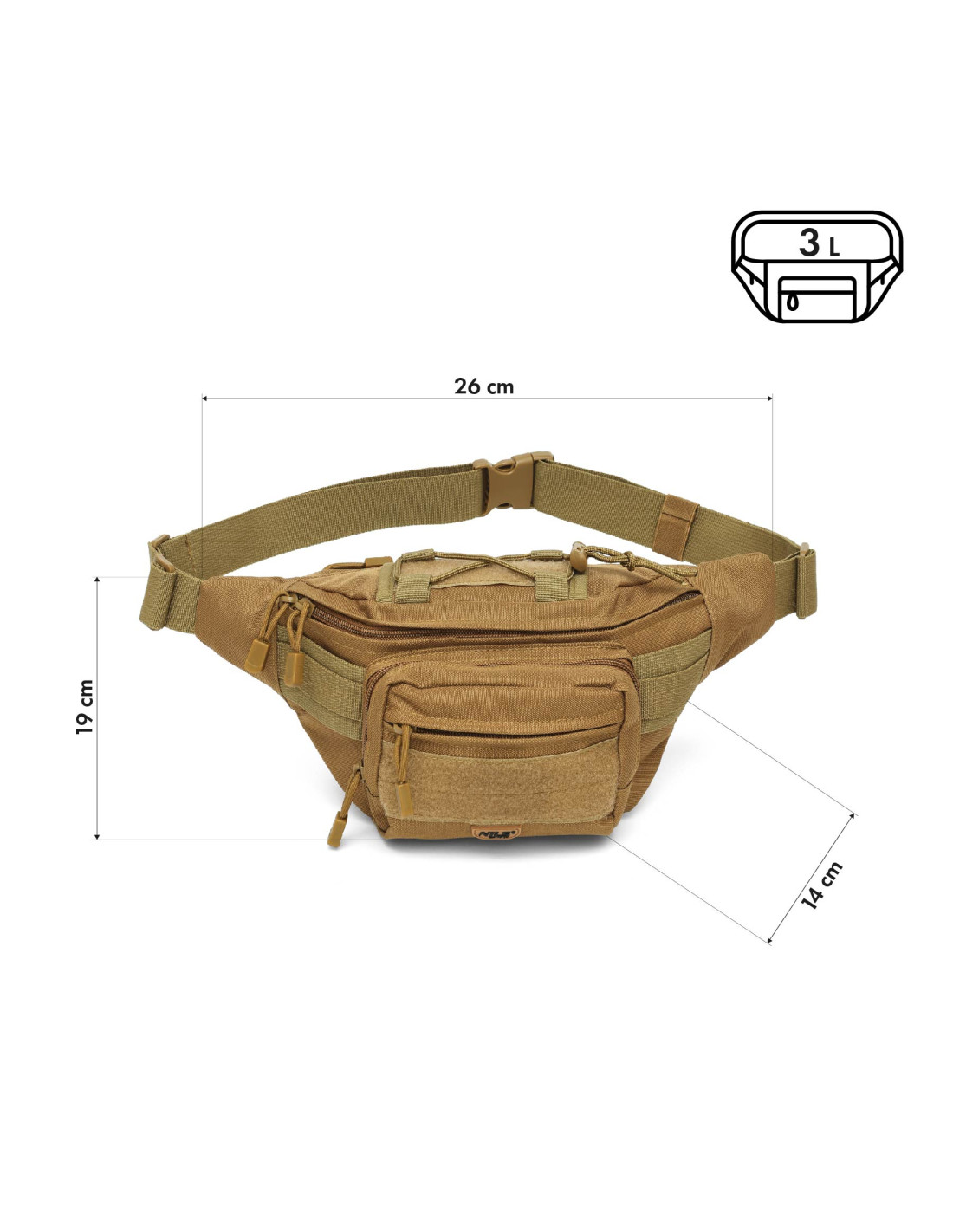 Чантата е с ширина 26 см, височина 19 см и дълбочина 14 см , което осигурява удобно прилягане, независимо от начина на носене. Може да се носи класически на ханша или през рамо. С тегло само 0,3 кг , тя е едва забележима, но е изключително практична.