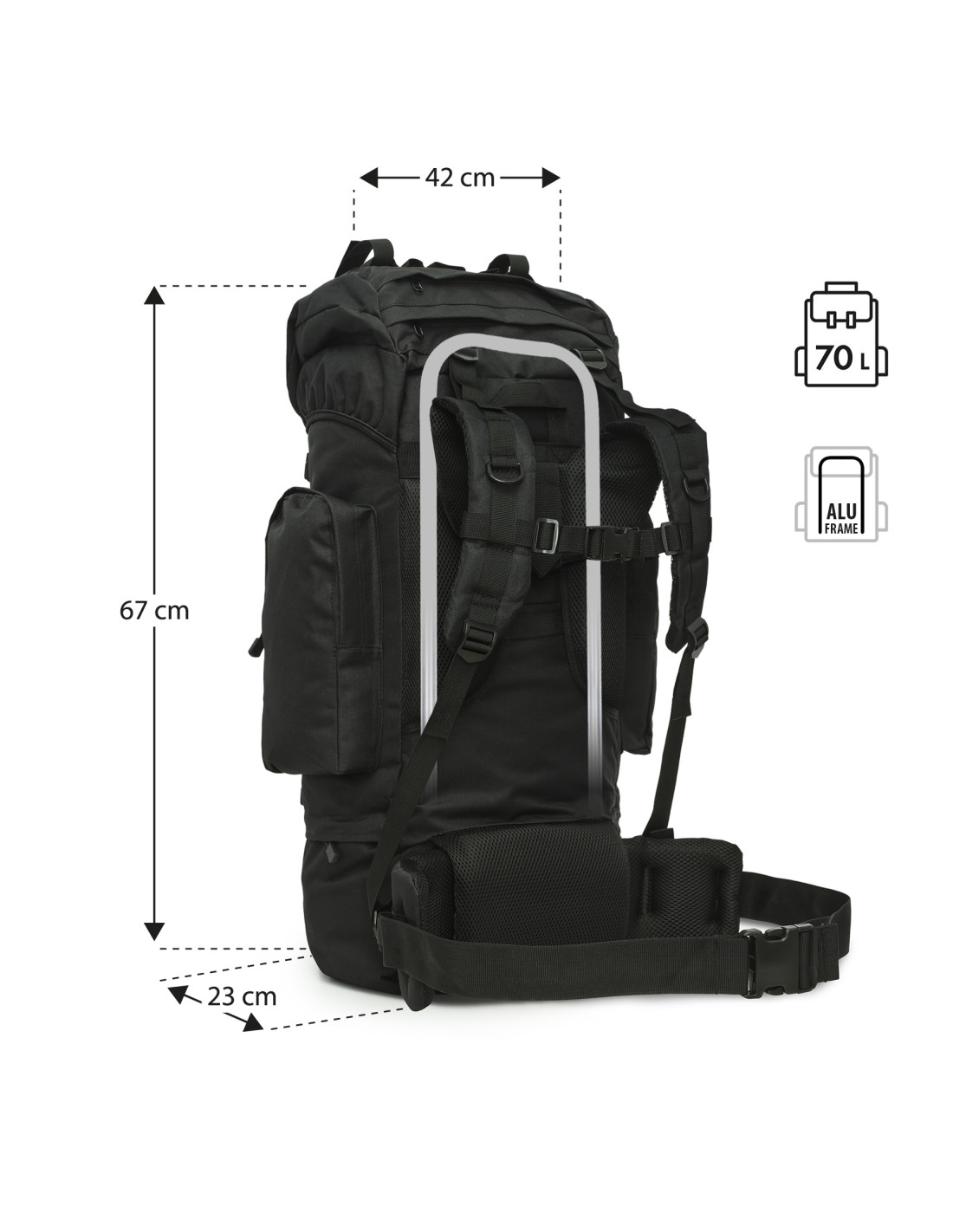 Военната раница NC3901 Eagle от NILS CAMP е чудесен избор за всеки, който цени надеждността, функционалността и готовността за употреба при всякакви условия. С впечатляващия си капацитет от 70 литра , тя предлага достатъчно място за цялото оборудване, необходимо за многодневно пътуване, от дрехи и храна до палатка и туристическа екипировка. Това е перфектният избор за любители на трекинг, бушкрафт и оцеляване, както и за всеки, който се готви за експедиции в труден планински или горски терен.
