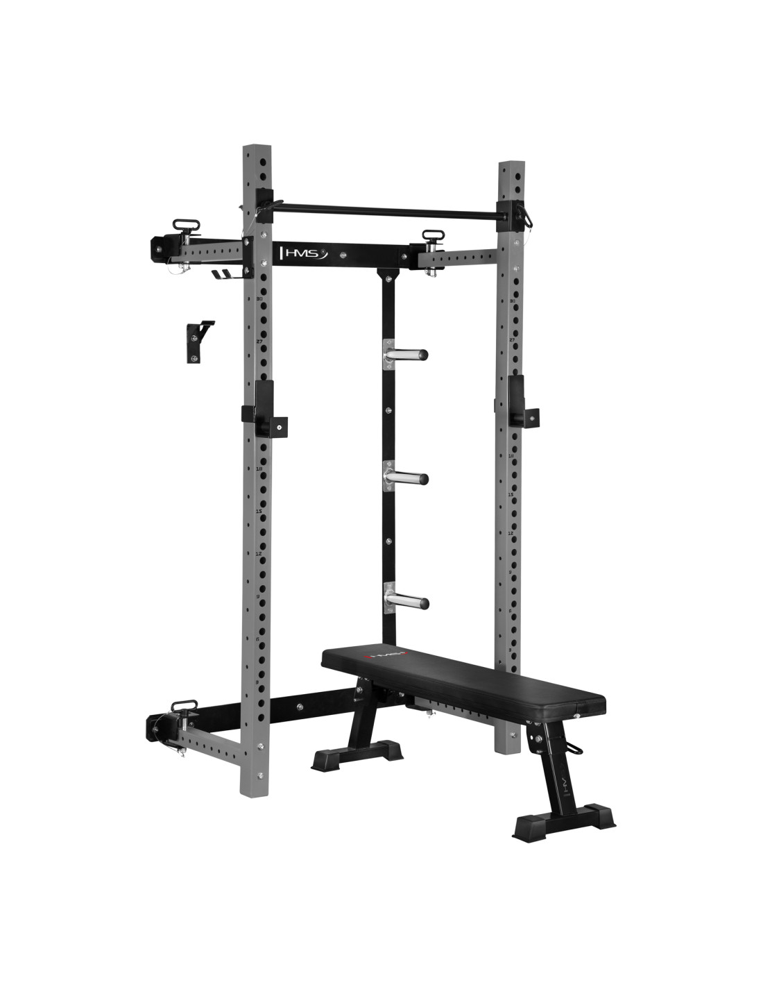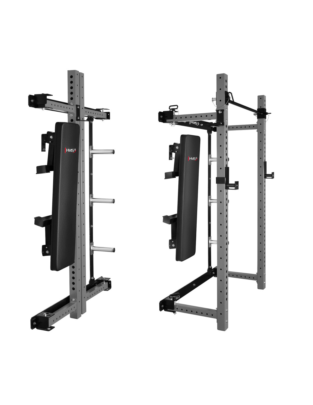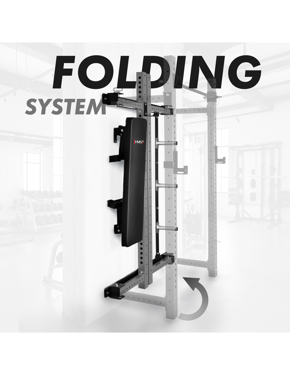 Тренировъчната клетка KLT34 HMS Fitness е оборудвана със сгъваема пейка , която позволява упражнения като лежанка, тренировки с дъмбели и упражнения за коремни мускули. След тренировка пейката може да се сгъне, спестявайки допълнително място.