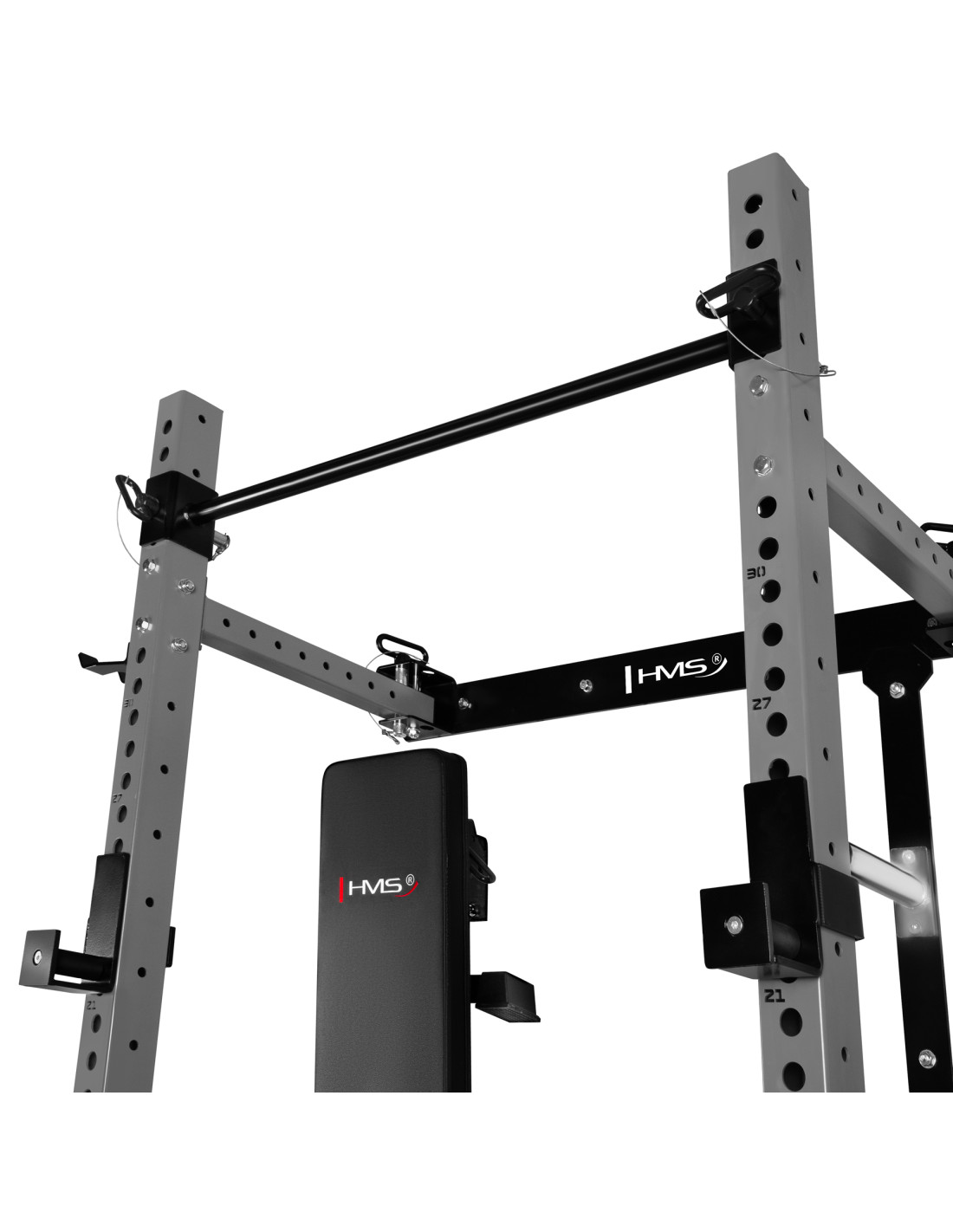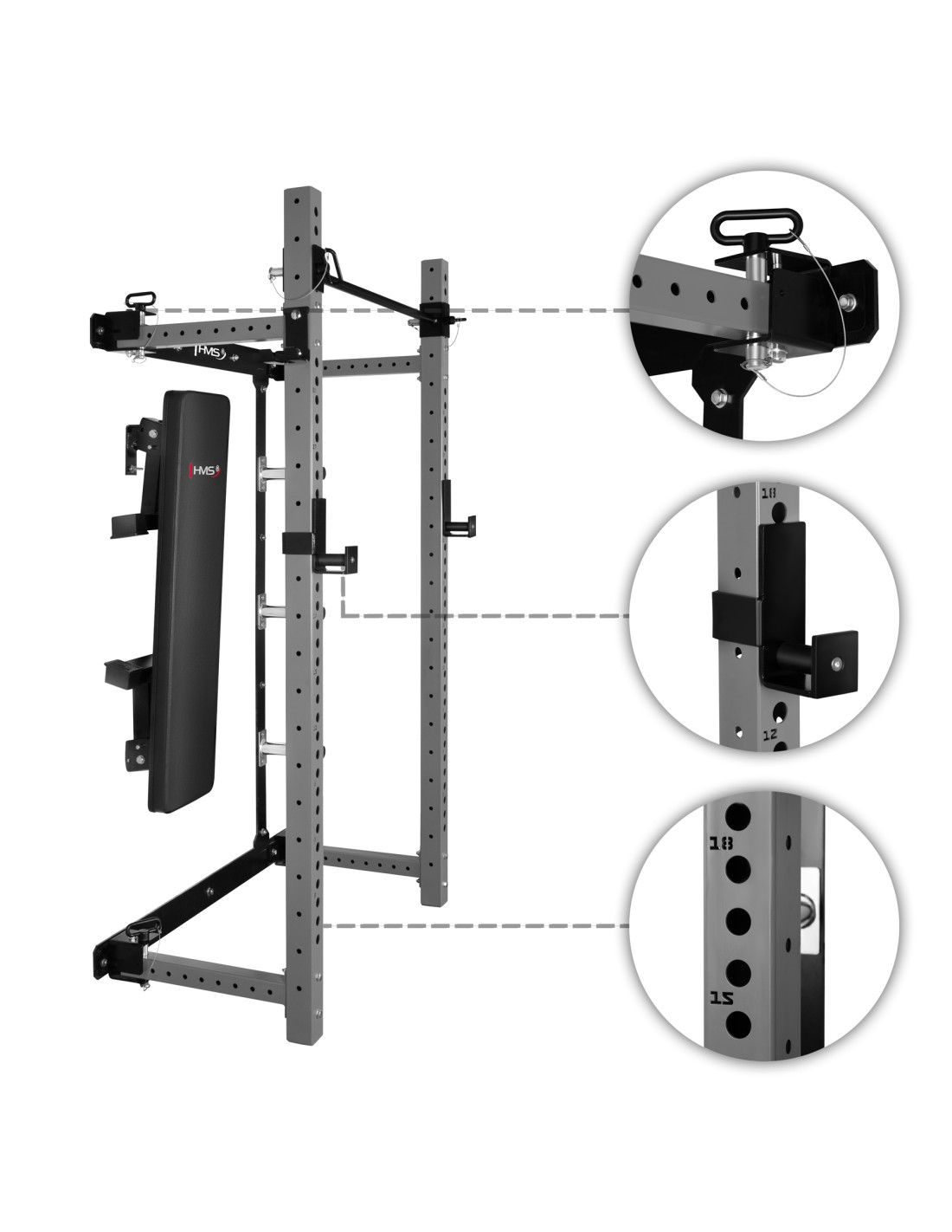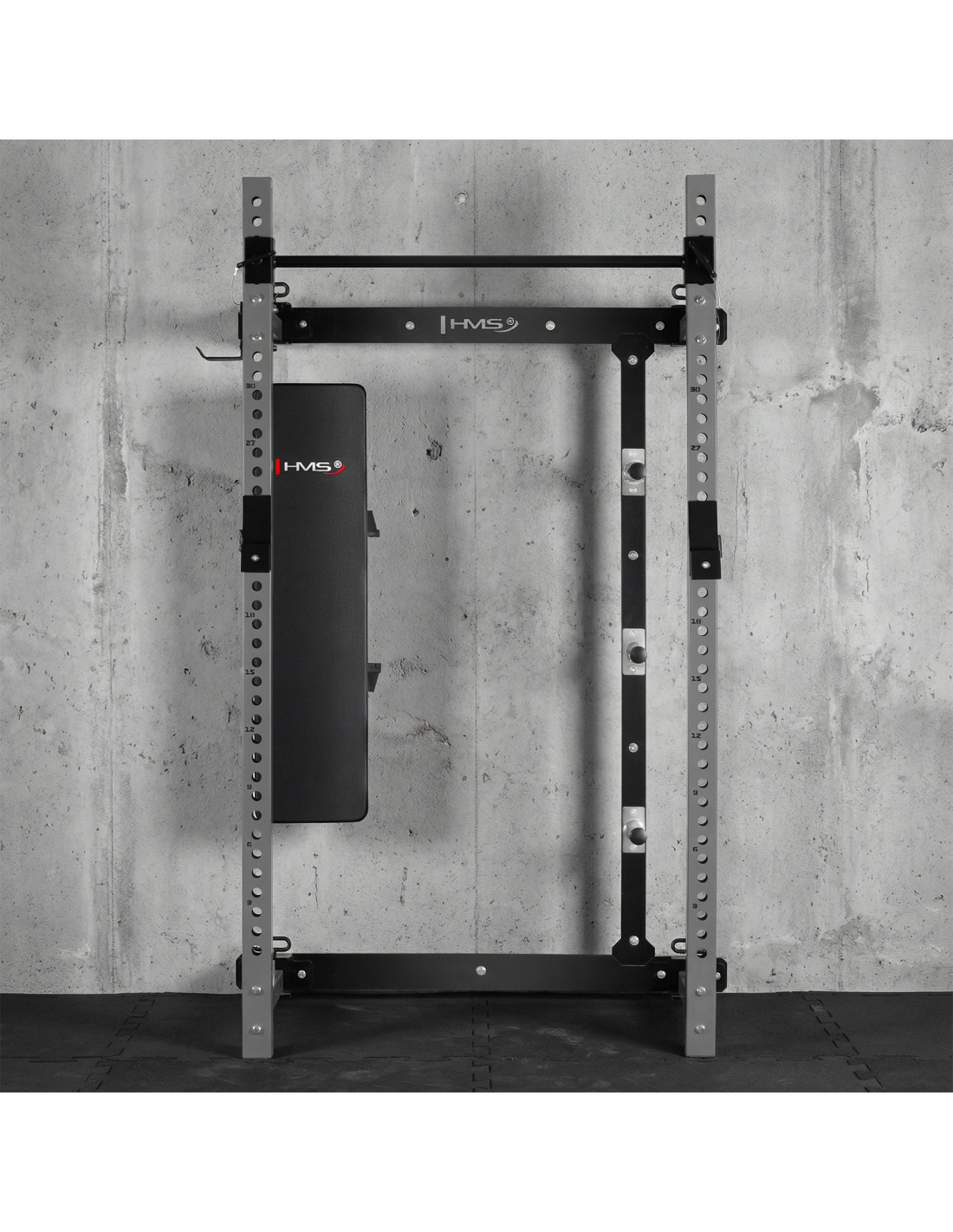 Тренировъчната клетка KLT34 HMS Fitness е оборудвана със сгъваема пейка , която позволява упражнения като лежанка, тренировки с дъмбели и упражнения за коремни мускули. След тренировка пейката може да се сгъне, спестявайки допълнително място.