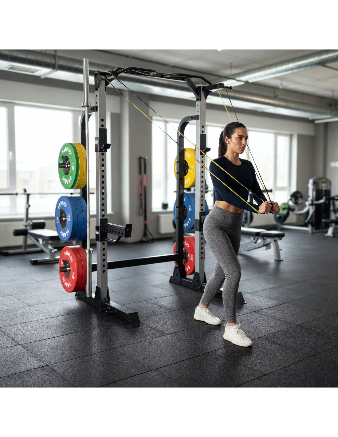 Силовата стойка HMS Fitness KLT5432 е оборудвана с допълнителни скоби за закрепване на ластици за съпротивление , разположени както в горната, така и в долната част на конструкцията . Това значително разширява възможностите за тренировка и позволява ефективни тренировки с ластици .