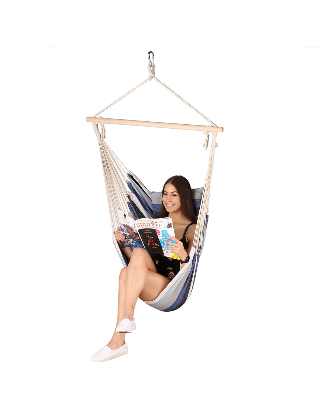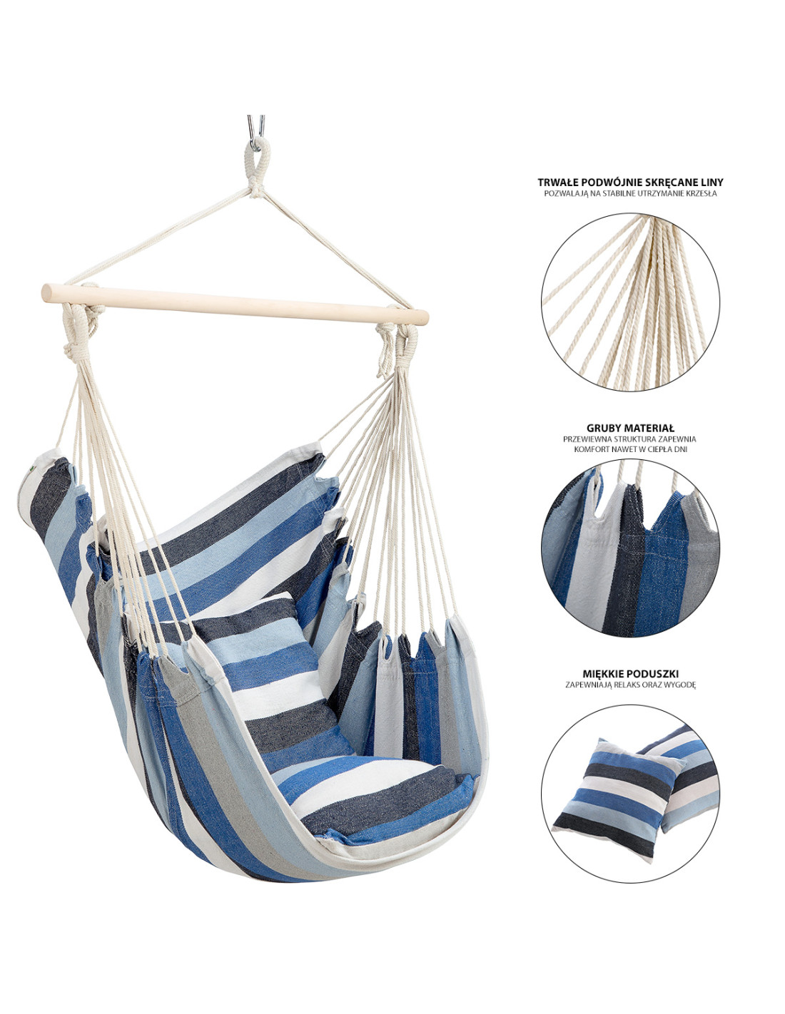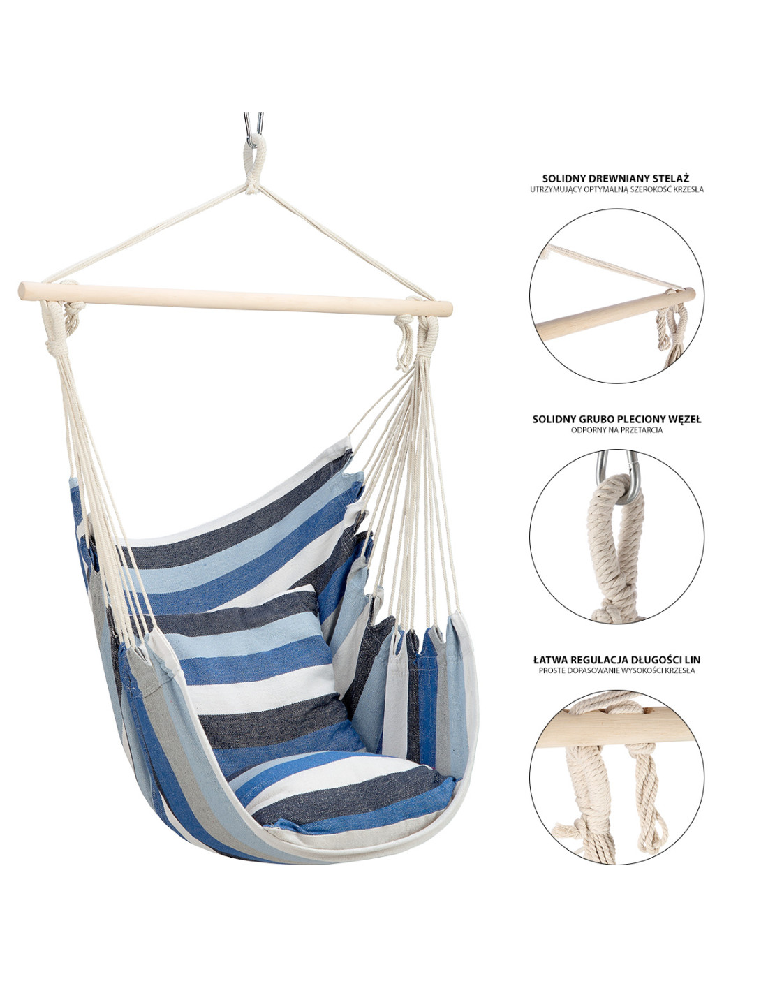 Този тип стол наподобява хамак, но е много по-лесен за поставяне. Това е така, защото го окачвате за дръжка. Това дава възможност да го поставим у дома, на балкона или в градината или дори да вземем любимия си стол на къмпинга. Този стол е и алтернатива, ако нямате достатъчно място за окачване на хамак. Подсилената стоманена дръжка ви позволява да използвате висящия стол безопасно и дълго време.