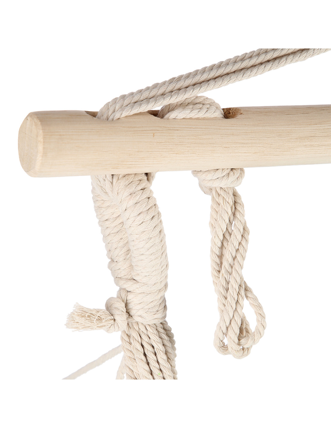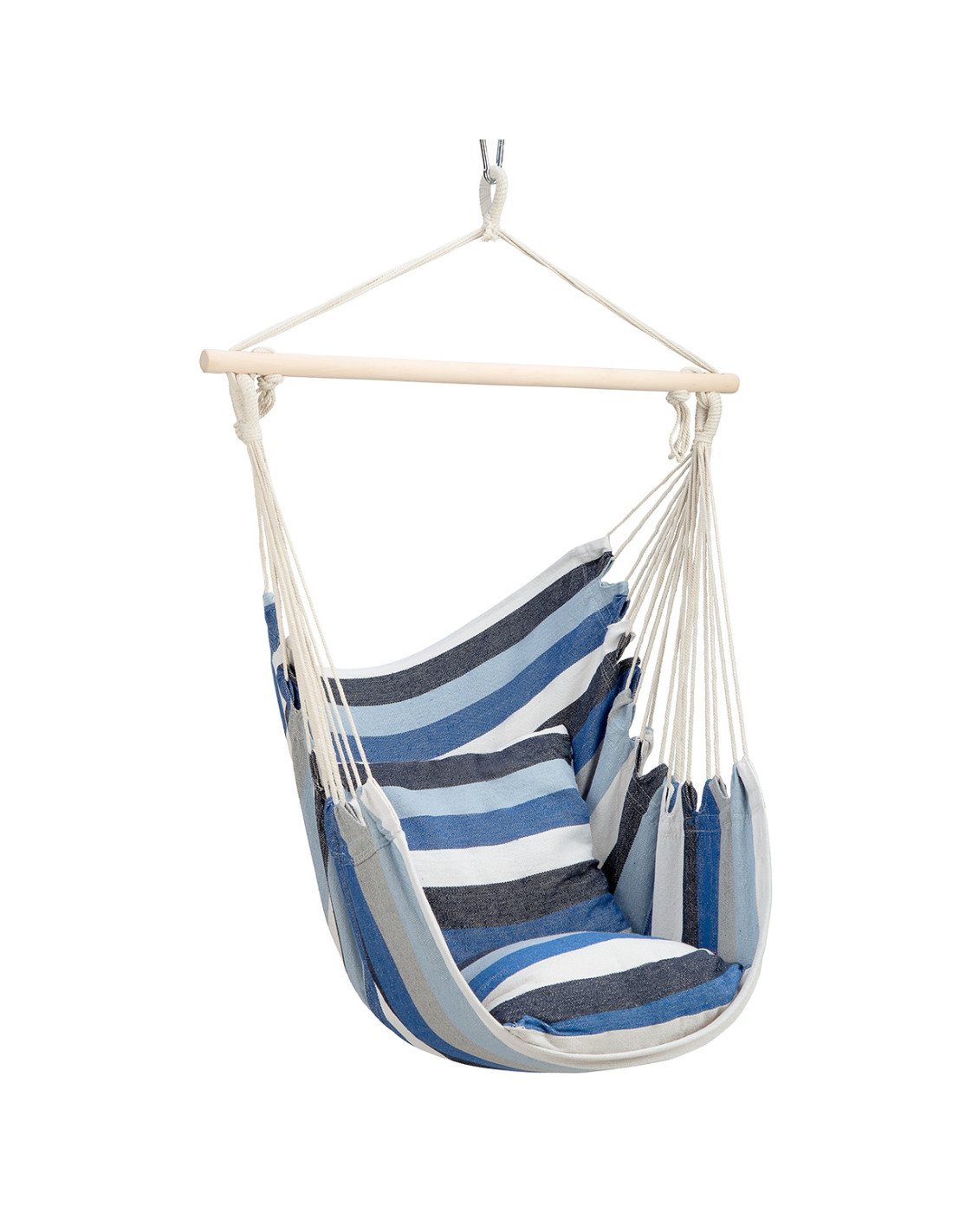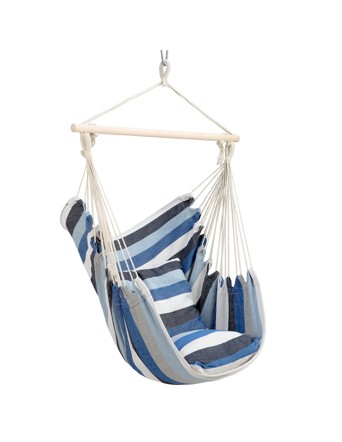 Този тип стол наподобява хамак, но е много по-лесен за поставяне. Това е така, защото го окачвате за дръжка. Това дава възможност да го поставим у дома, на балкона или в градината или дори да вземем любимия си стол на къмпинга. Този стол е и алтернатива, ако нямате достатъчно място за окачване на хамак. Подсилената стоманена дръжка ви позволява да използвате висящия стол безопасно и дълго време.
