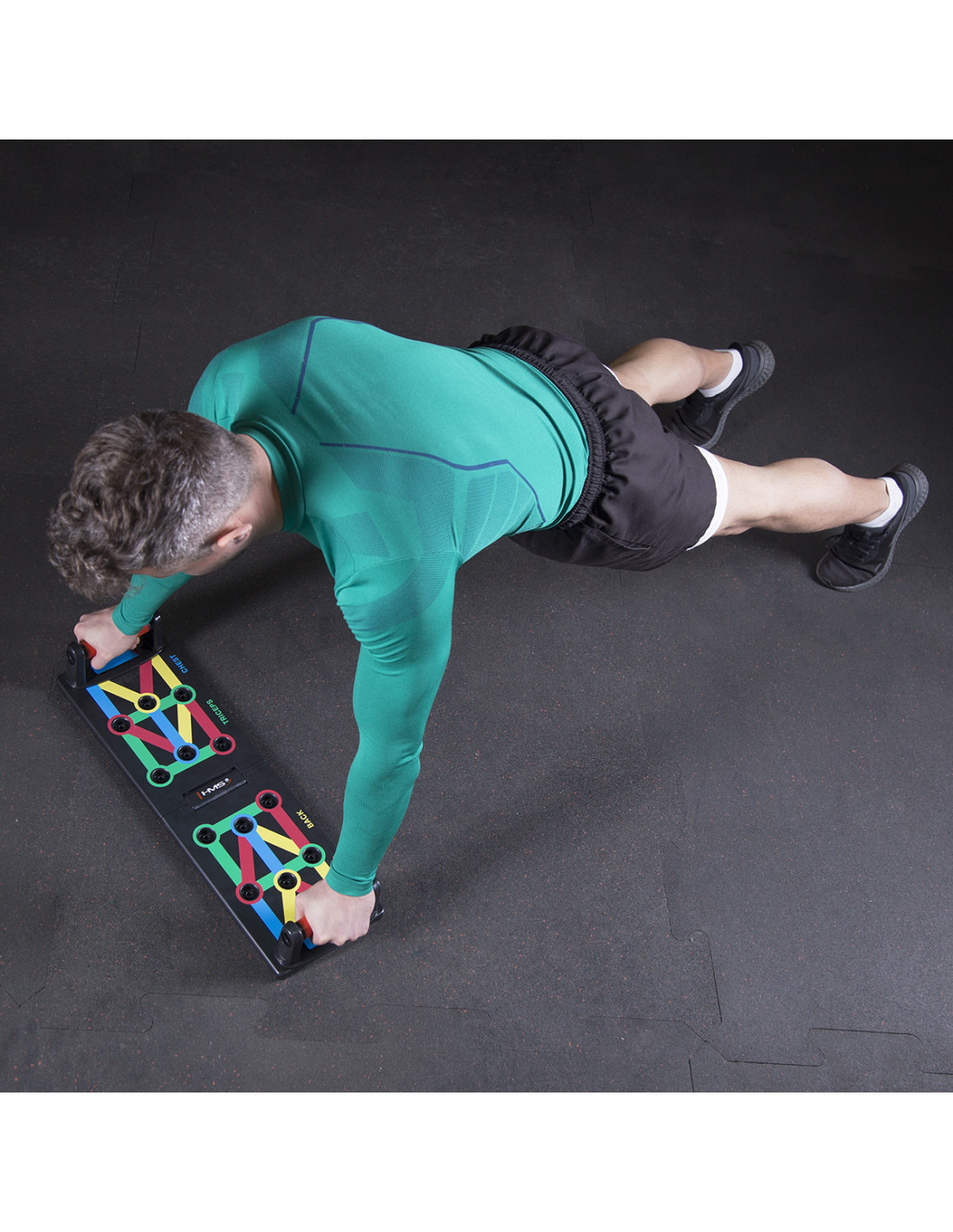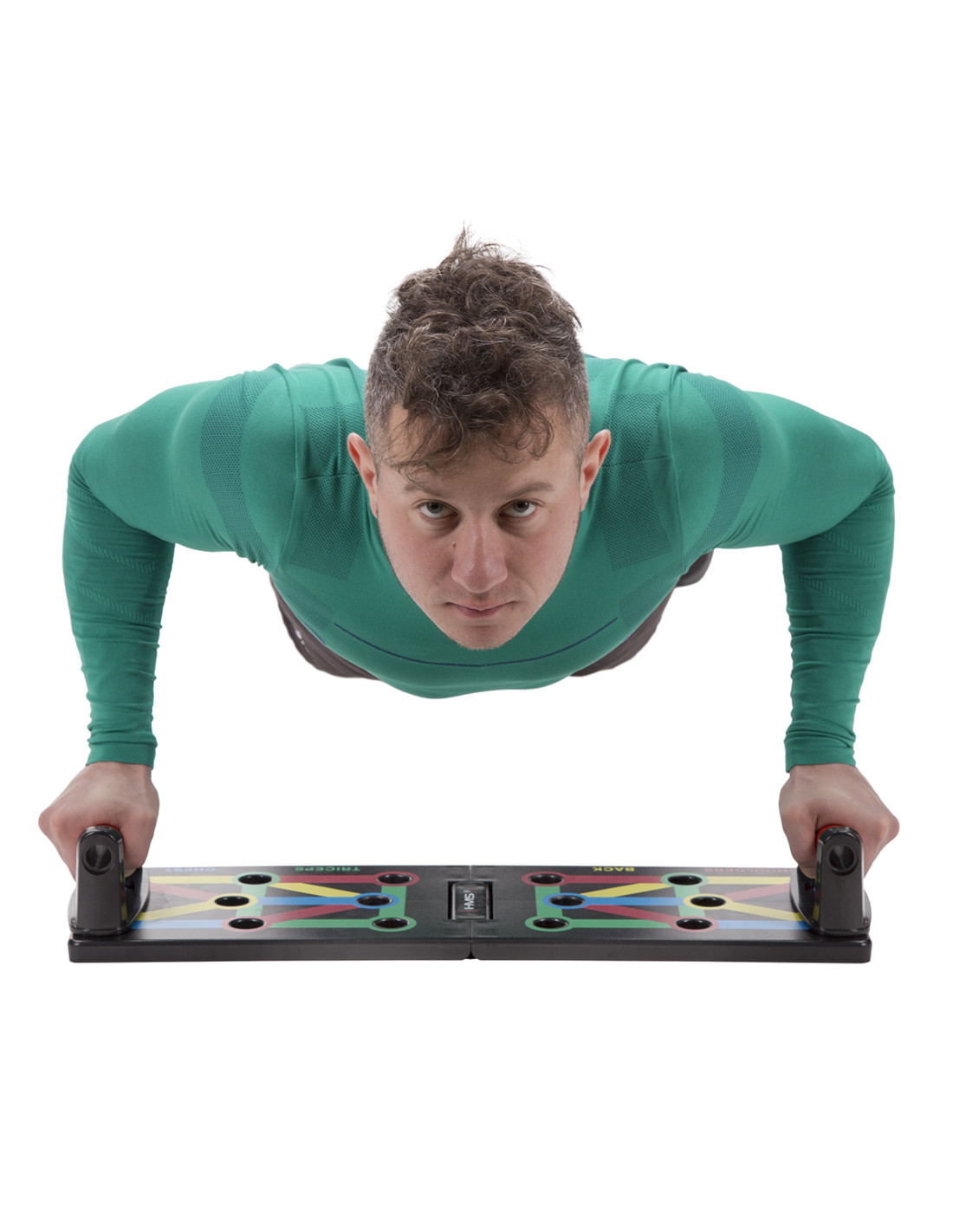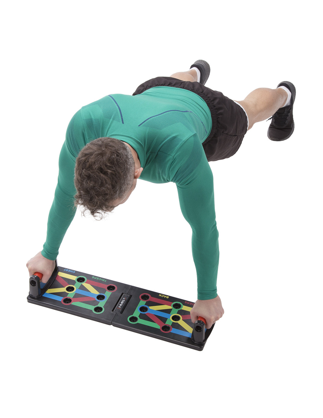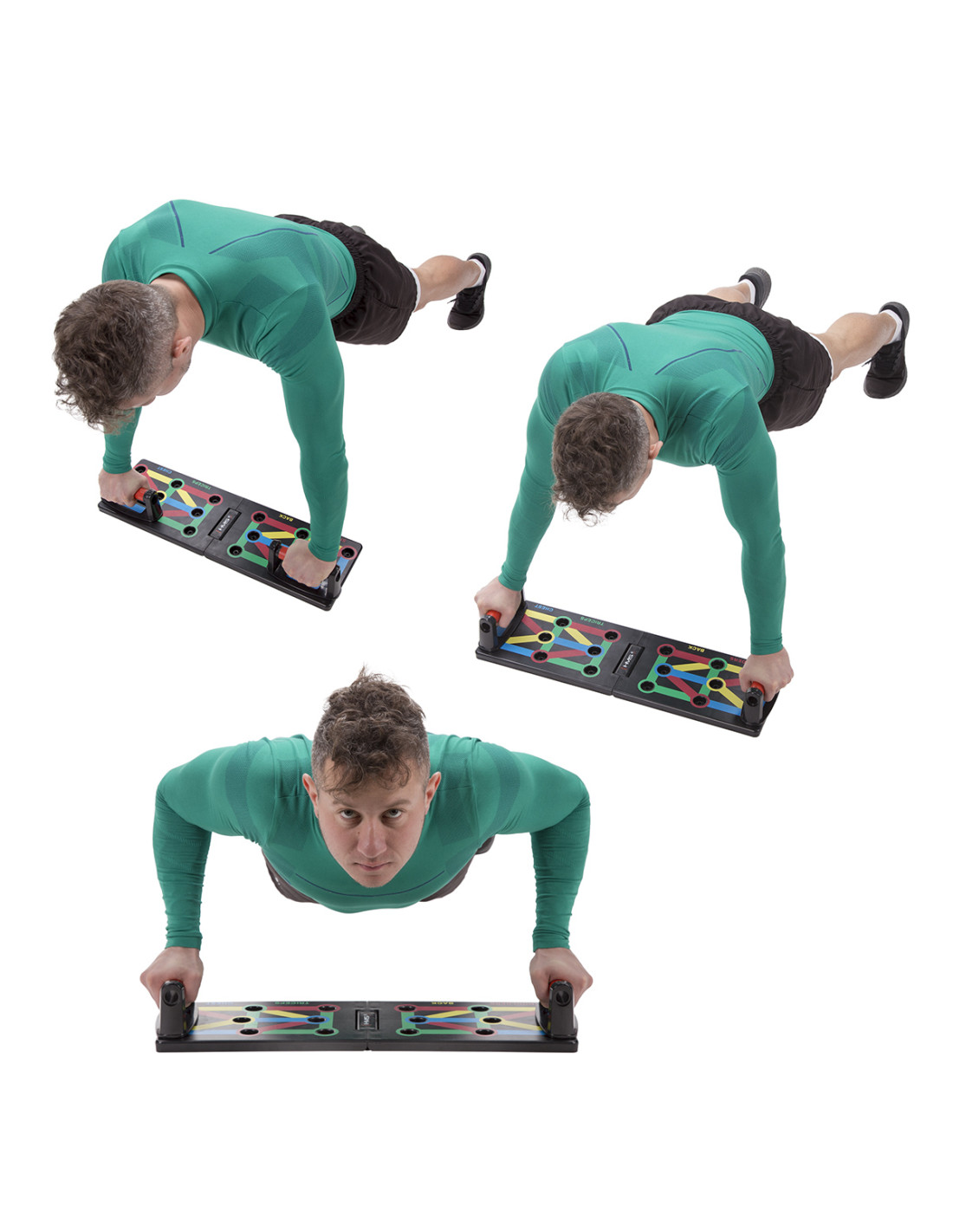 Използвайки тази дъска за лицеви опори, можете да тренирате почти цялата си горна част на тялото. Това може да се постигне чрез регулиране на дръжките в желаната позиция. Всяка корекция ви позволява да се насочите към различна мускулна група или към същия мускул, но работата на този мускул ще бъде различна. Това прави тренировката по-сложна. С тази дъска за лицеви опори можете да изпълнявате упражнения за гръдните мускули, трицепсите, раменете и мускулите на гърба. Всяка мускулна група е маркирана с различен цвят на дъската. Значението на цвета е описано по такъв начин, че смяната на позициите по време на тренировка може да бъде много бърза и лесна.