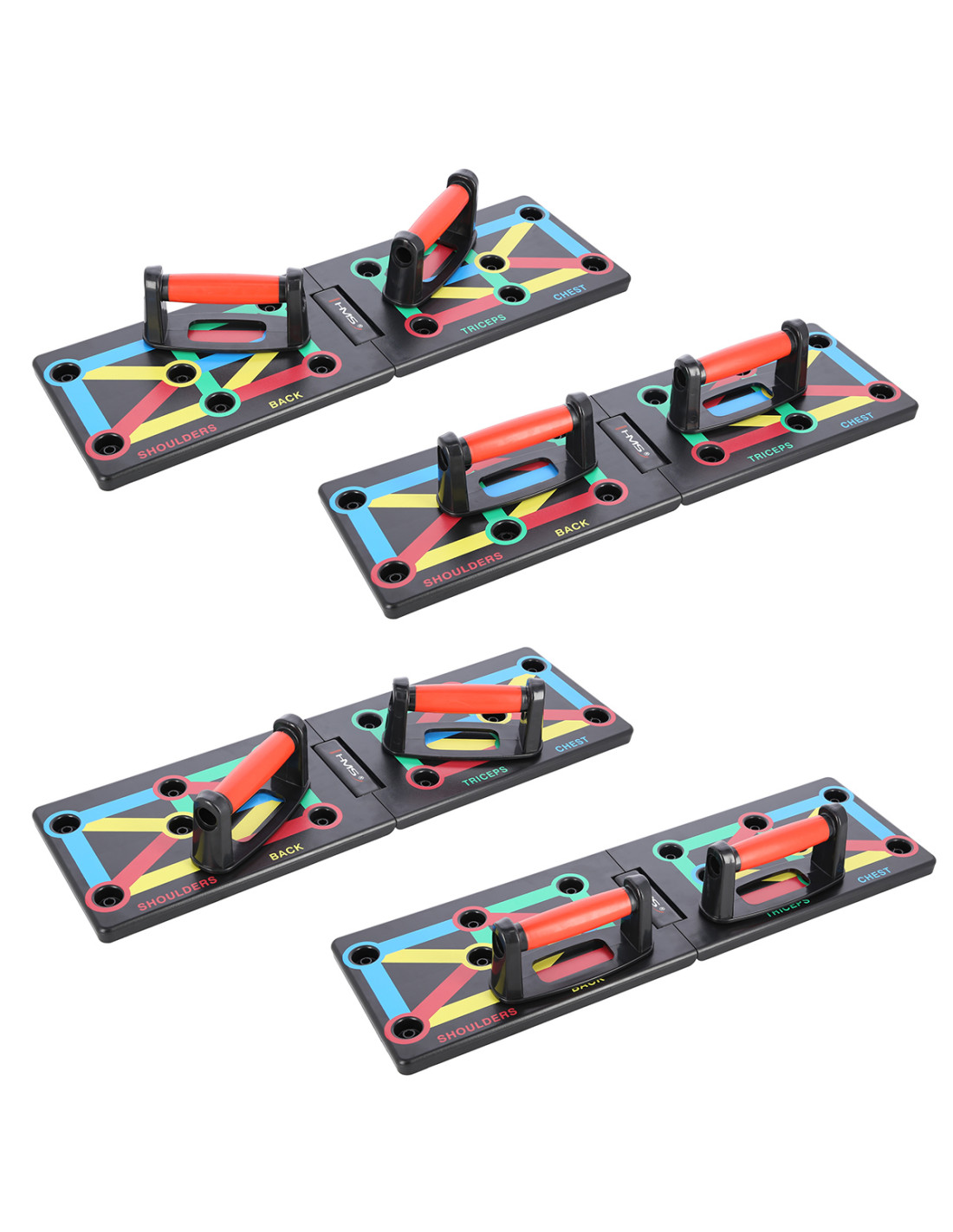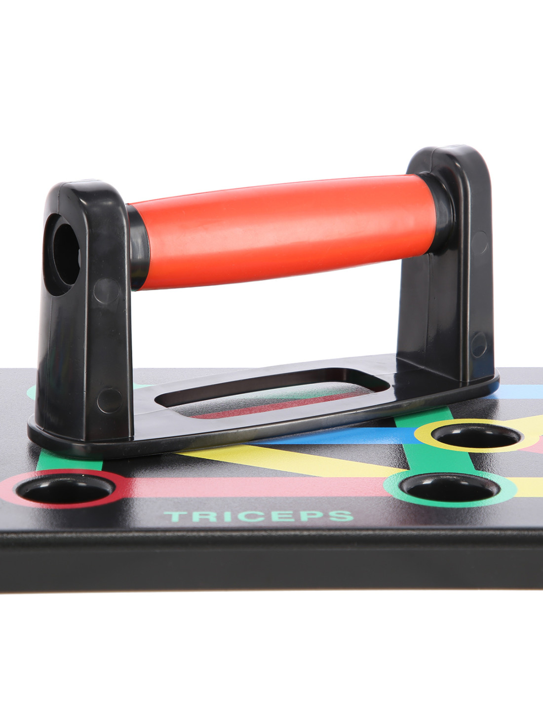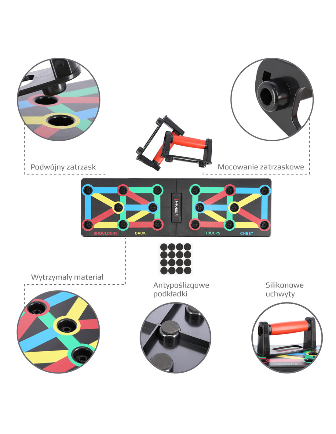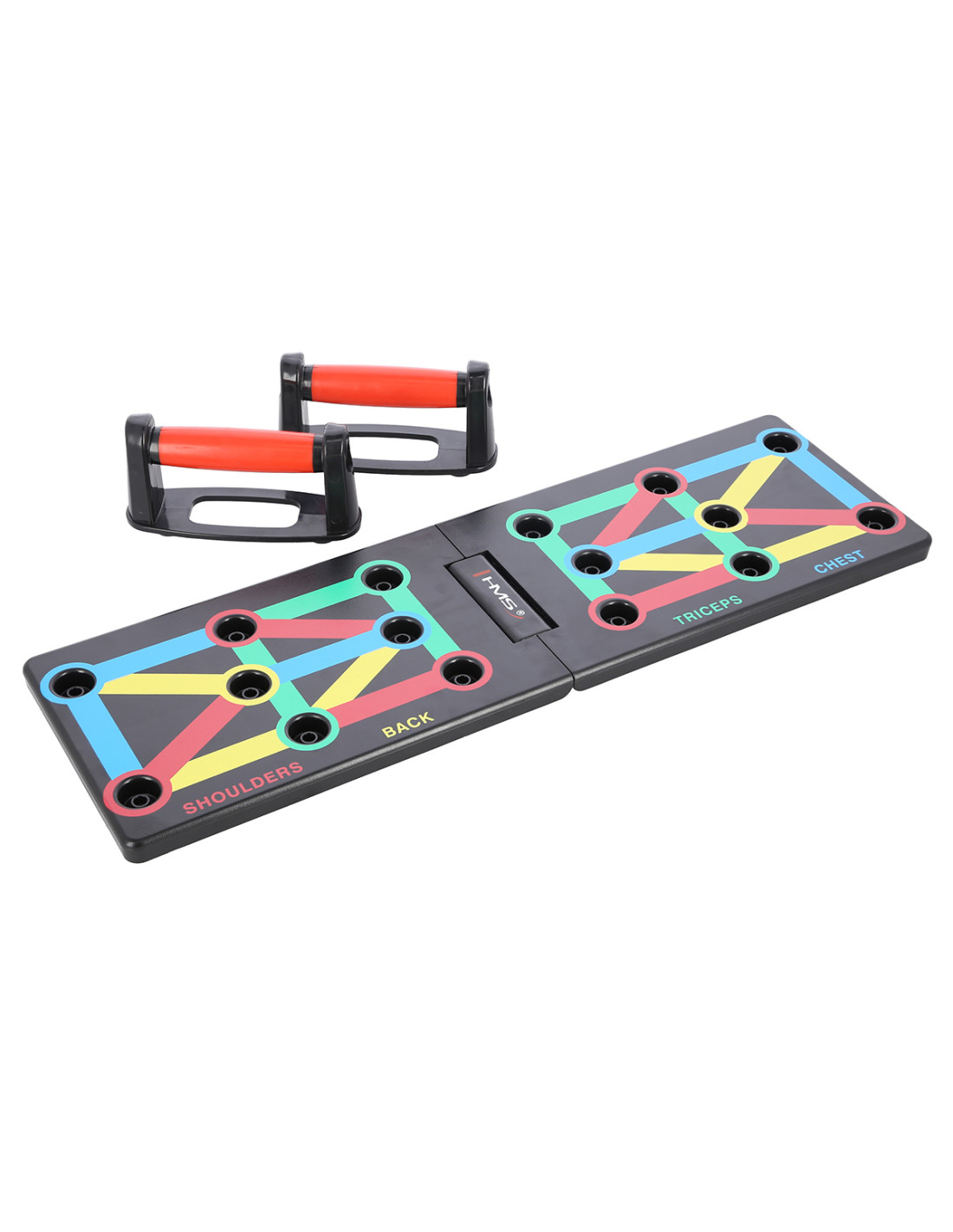 Използвайки тази дъска за лицеви опори, можете да тренирате почти цялата си горна част на тялото. Това може да се постигне чрез регулиране на дръжките в желаната позиция. Всяка корекция ви позволява да се насочите към различна мускулна група или към същия мускул, но работата на този мускул ще бъде различна. Това прави тренировката по-сложна. С тази дъска за лицеви опори можете да изпълнявате упражнения за гръдните мускули, трицепсите, раменете и мускулите на гърба. Всяка мускулна група е маркирана с различен цвят на дъската. Значението на цвета е описано по такъв начин, че смяната на позициите по време на тренировка може да бъде много бърза и лесна.