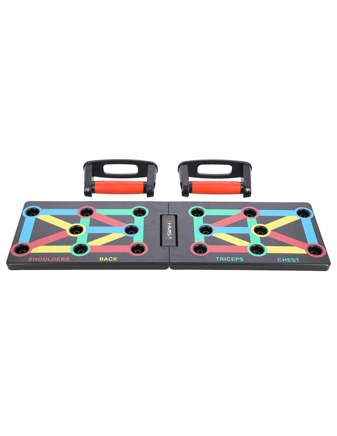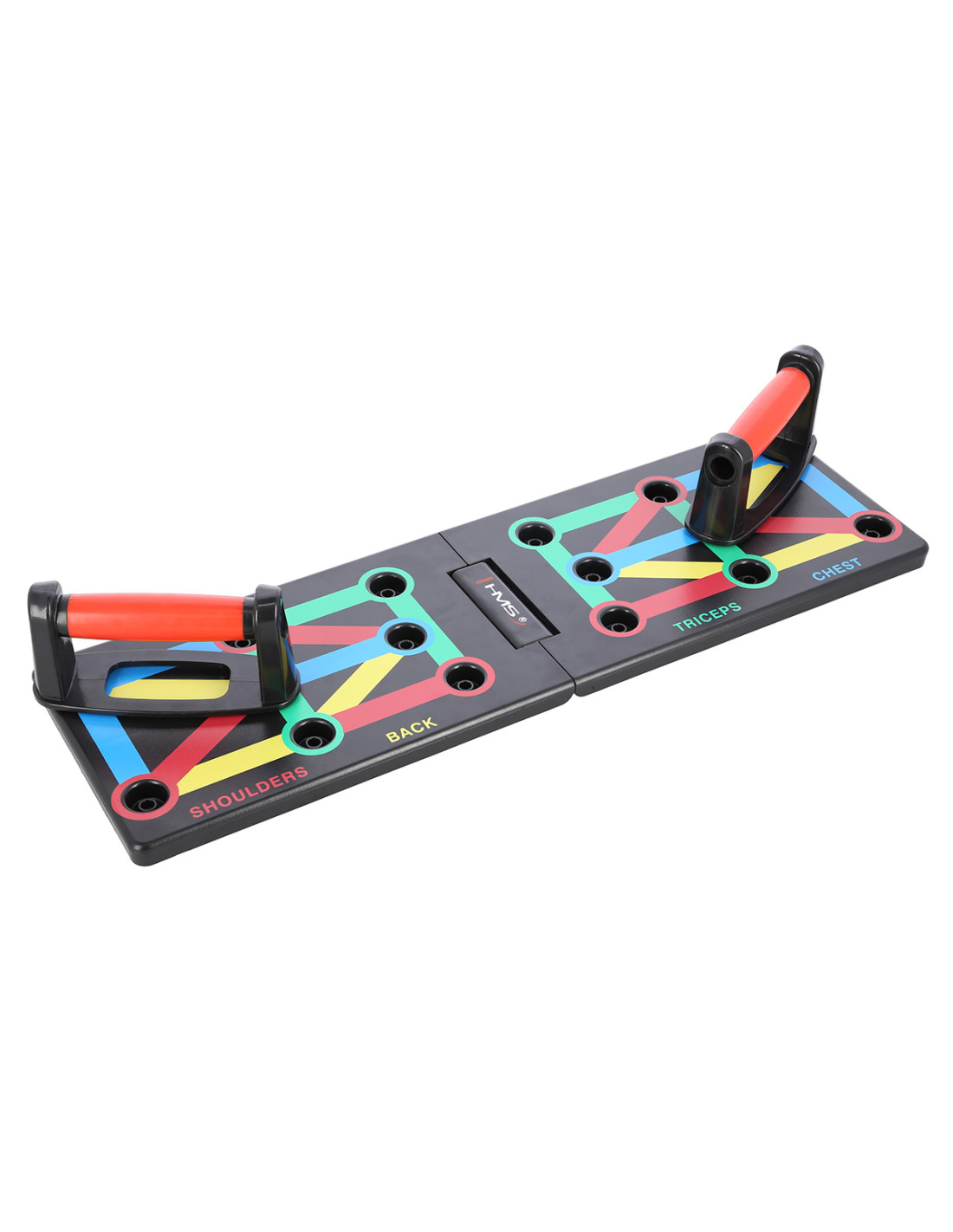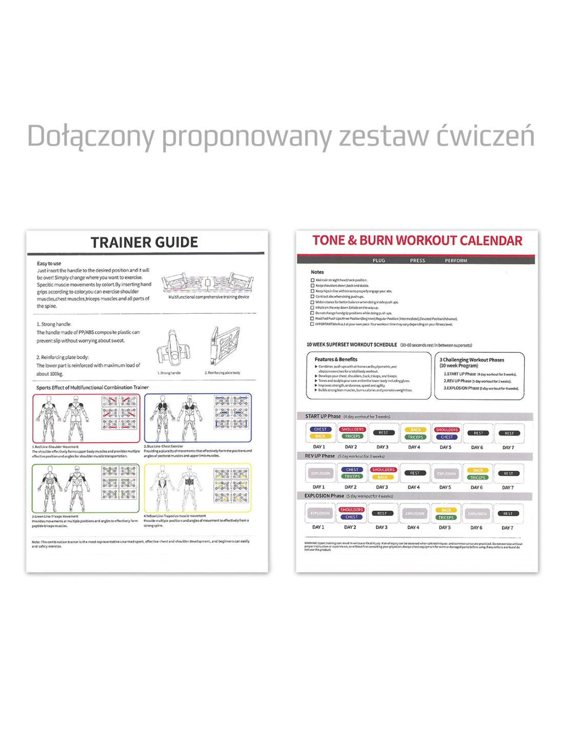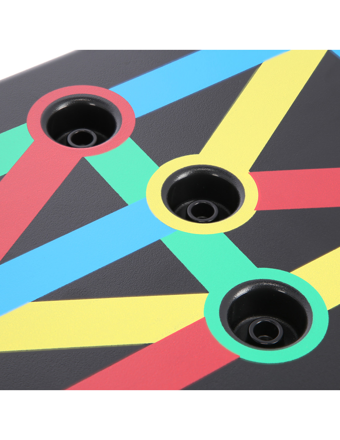 Използвайки тази дъска за лицеви опори, можете да тренирате почти цялата си горна част на тялото. Това може да се постигне чрез регулиране на дръжките в желаната позиция. Всяка корекция ви позволява да се насочите към различна мускулна група или към същия мускул, но работата на този мускул ще бъде различна. Това прави тренировката по-сложна. С тази дъска за лицеви опори можете да изпълнявате упражнения за гръдните мускули, трицепсите, раменете и мускулите на гърба. Всяка мускулна група е маркирана с различен цвят на дъската. Значението на цвета е описано по такъв начин, че смяната на позициите по време на тренировка може да бъде много бърза и лесна.