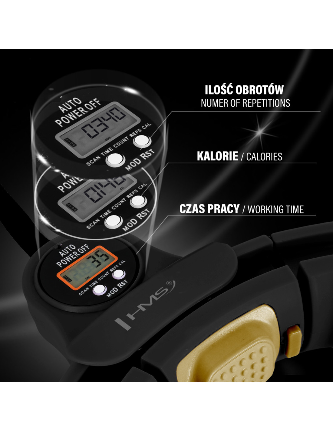 Die Konstruktion des Hula-Hoop-Reifens von HMS ist aus hochwertigen Materialien gefertigt. Die richtige Auswahl der besten Komponenten wird Ihnen volle Zufriedenheit garantieren und der eingebaute Zähler ermöglicht es Ihnen, die verbrannten Kalorien, die Anzahl der Umdrehungen und die Trainingsdauer zu überprüfen. Die Bewegung ist flexibel und angenehm für den Körper. Der mit Sand gefüllte Schwerkraftball garantiert die Sicherheit sowohl für den Benutzer als auch für den Ort, an dem Sie trainieren.