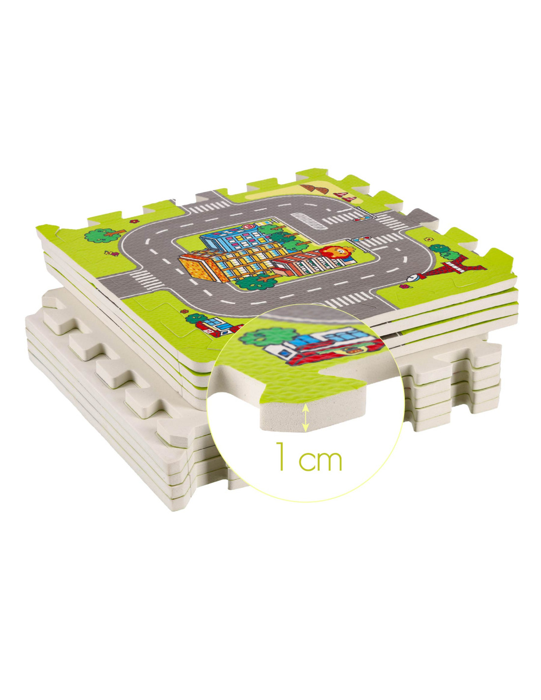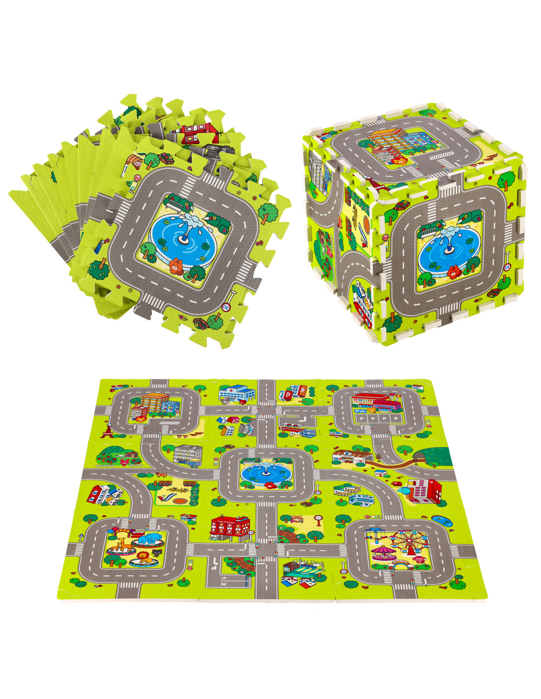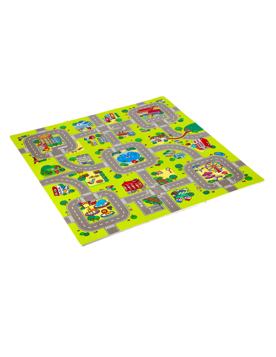 Подложката съдържа 9 пъзела, които заедно създават цветна карта на града с улици и други елементи от градския пейзаж. Това е не само страхотно забавление, но и възможност за учене чрез откриване. Пъзелите помагат за развитието на когнитивните умения и насърчават развитието на ръчните умения на детето.