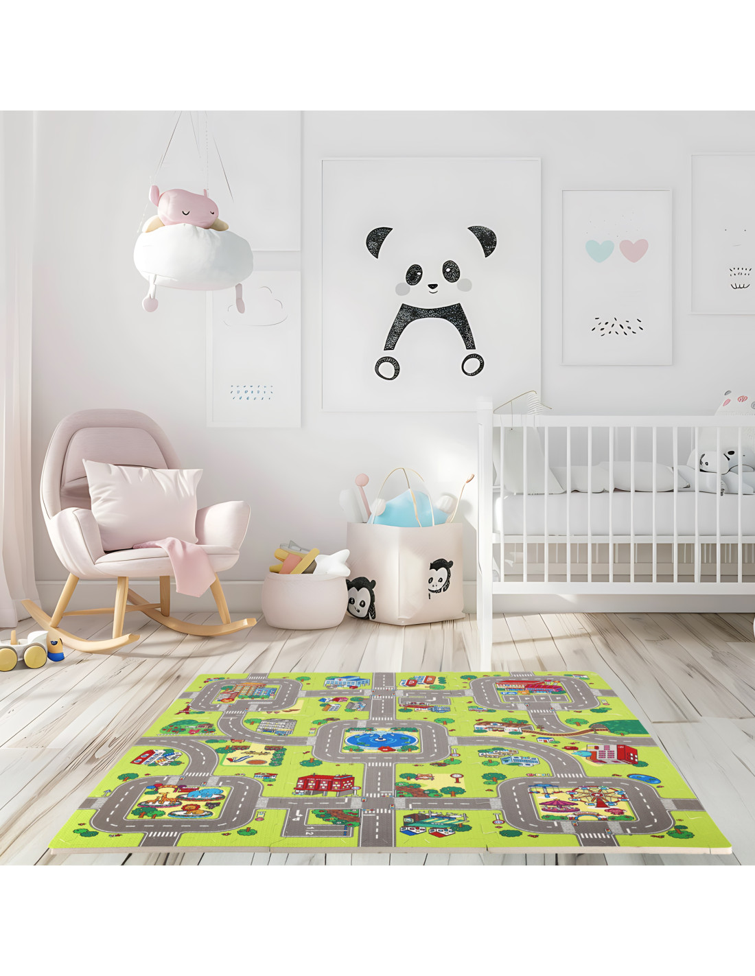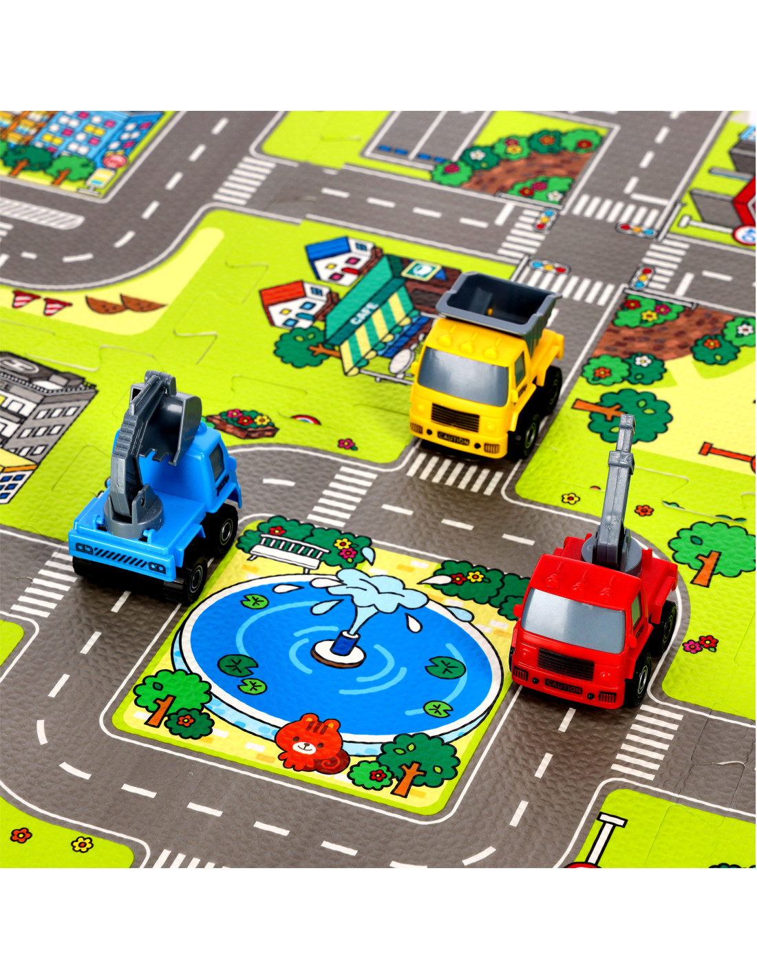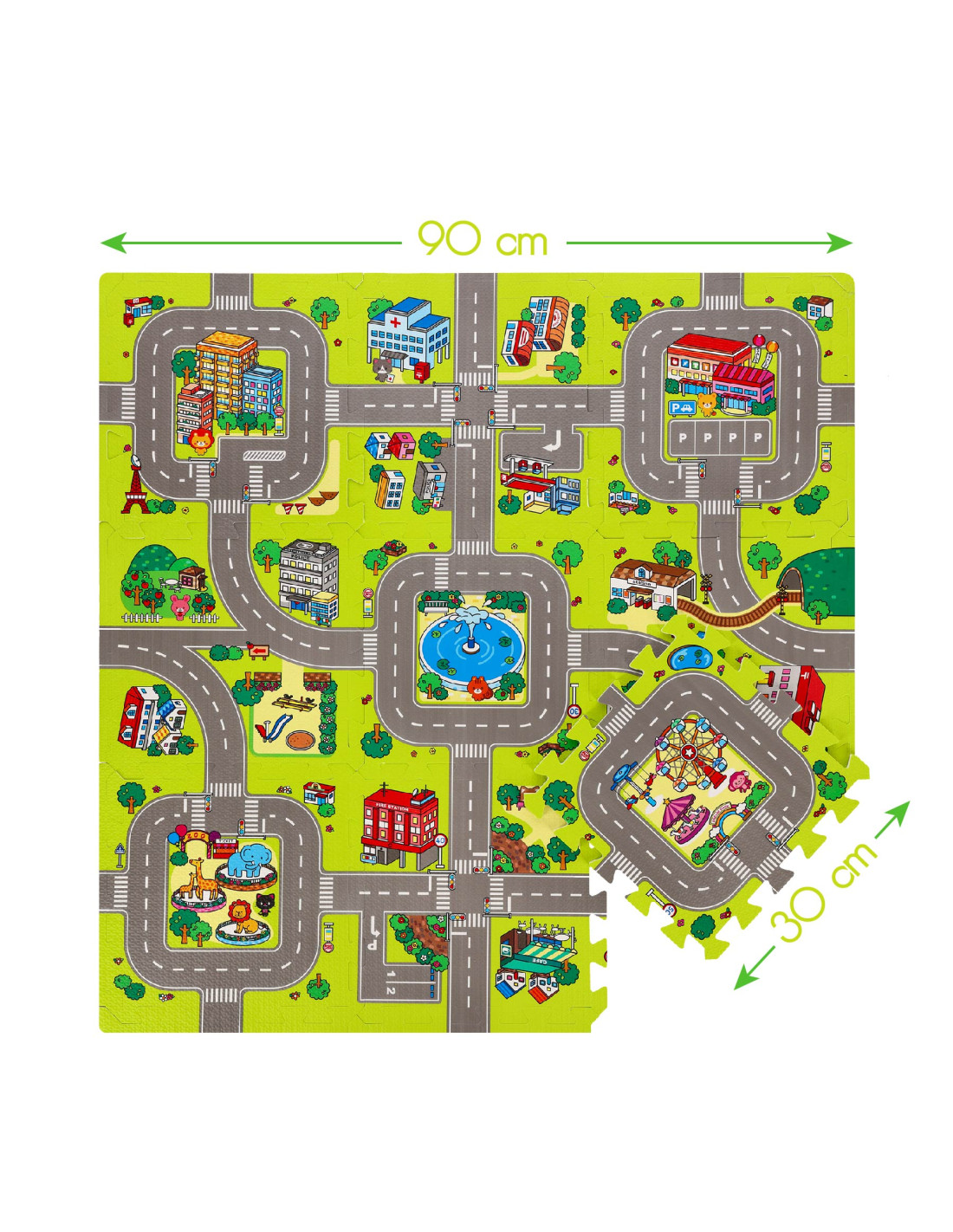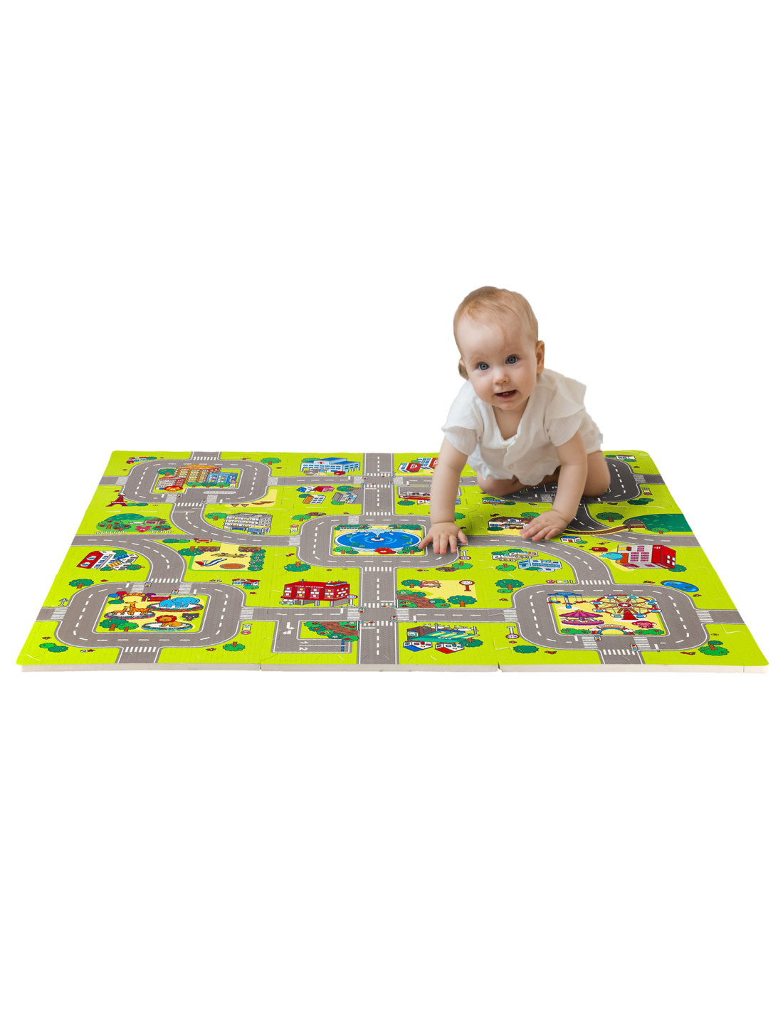 Подложката съдържа 9 пъзела, които заедно създават цветна карта на града с улици и други елементи от градския пейзаж. Това е не само страхотно забавление, но и възможност за учене чрез откриване. Пъзелите помагат за развитието на когнитивните умения и насърчават развитието на ръчните умения на детето.