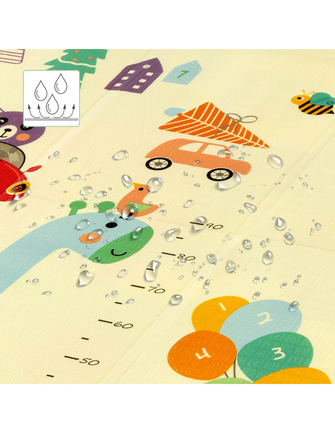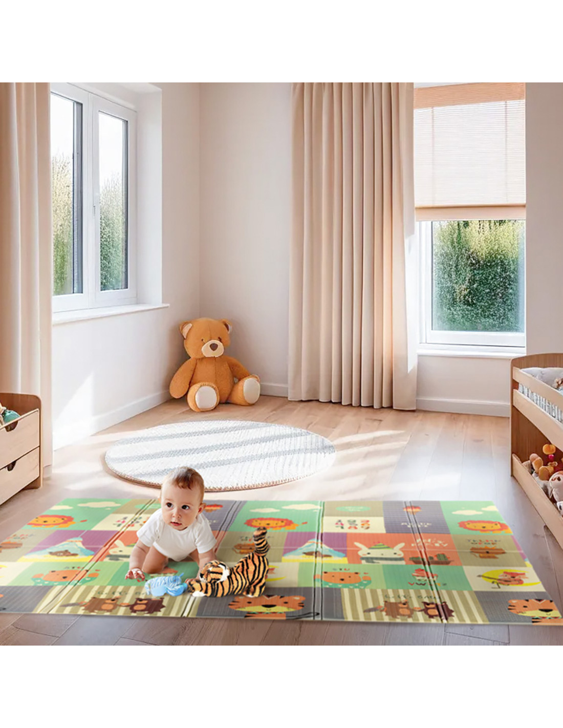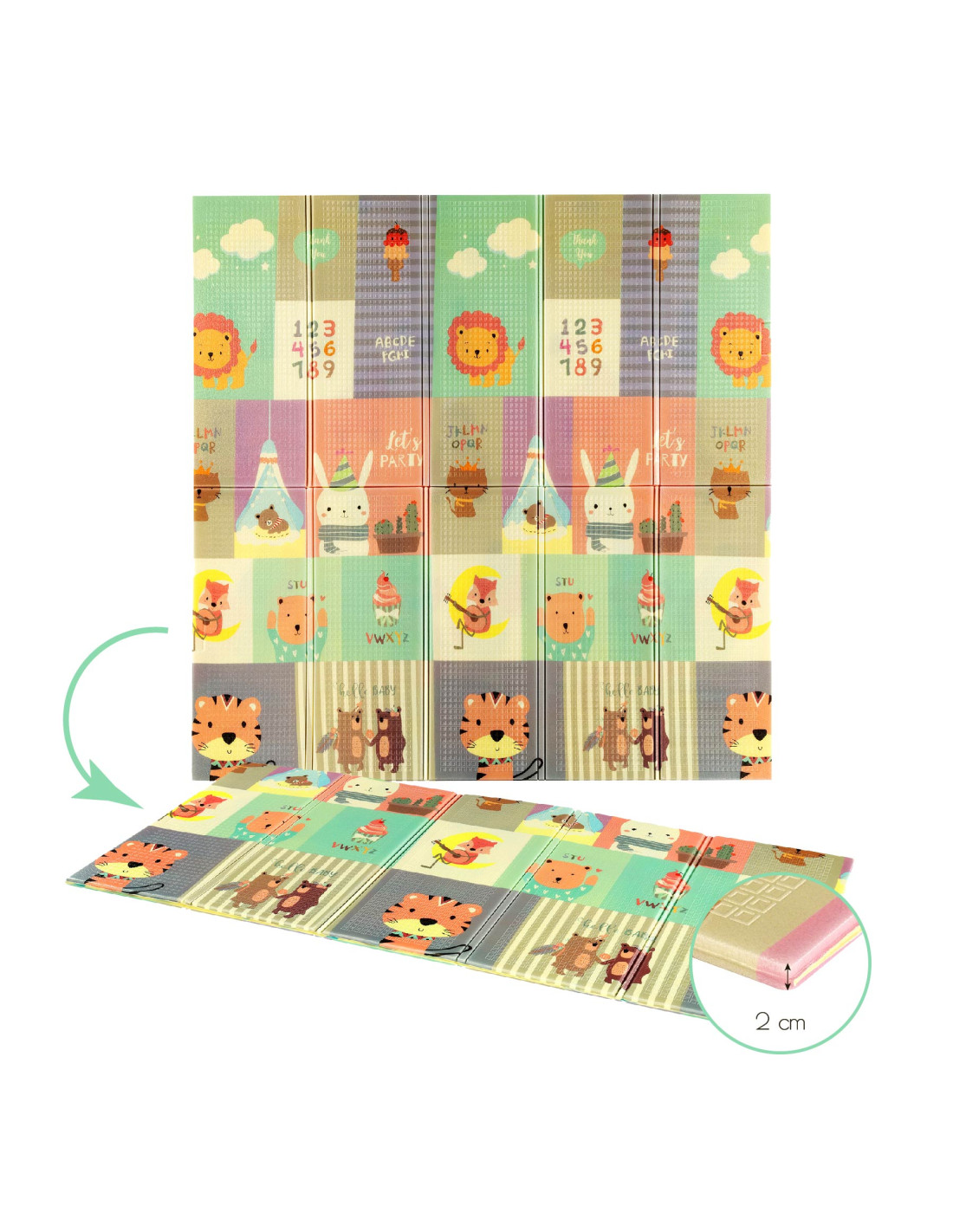 Постелката може да се използва не само за игра, но и като образователно средство. С релефни цифри и букви за подпомагане на четенето и илюстрации на плюшени мечета, тигри, коали и други животни, той подпомага сетивното и когнитивното развитие на вашето дете. Двустранният дизайн на постелката позволява смяна на обстановката, осигурявайки разнообразна стимулация и поддържайки интереса на бебето.