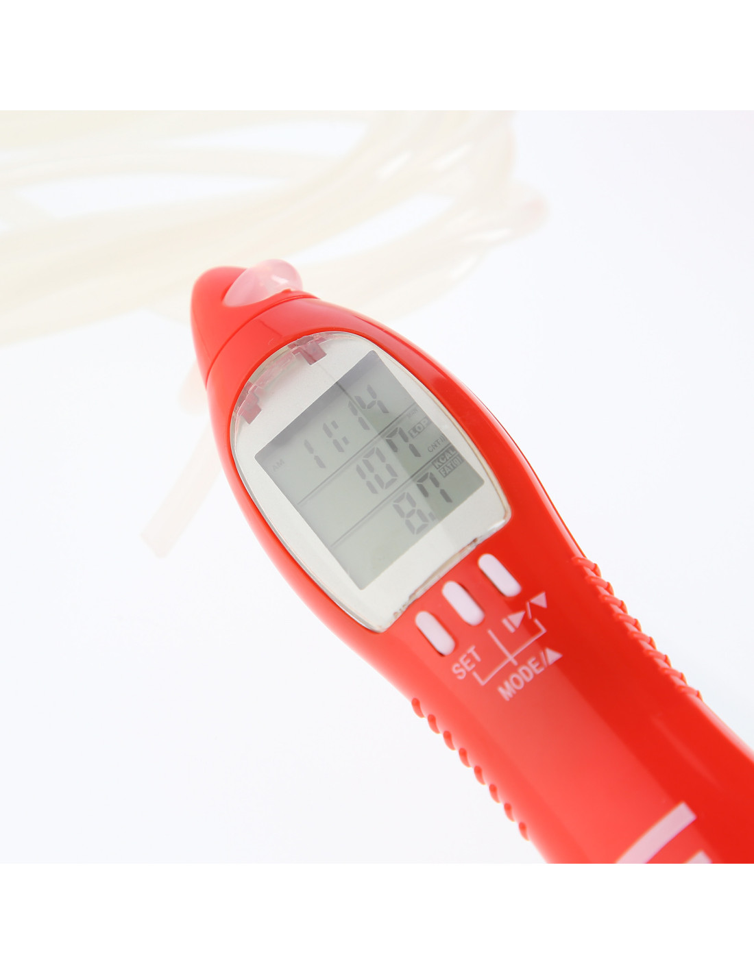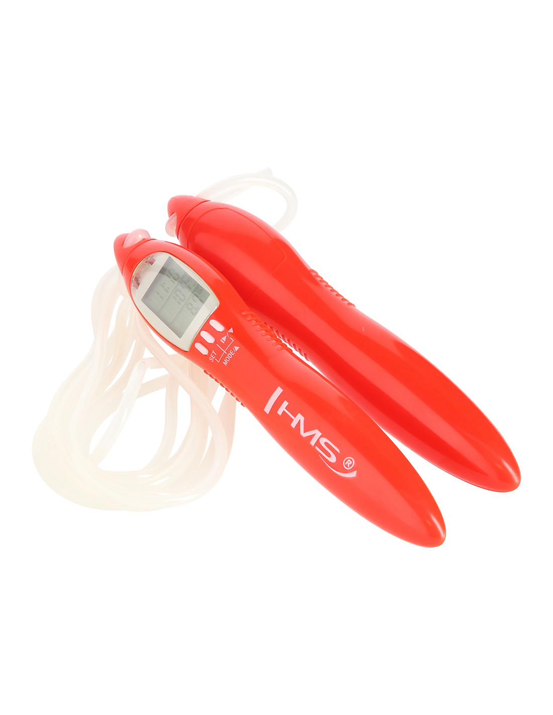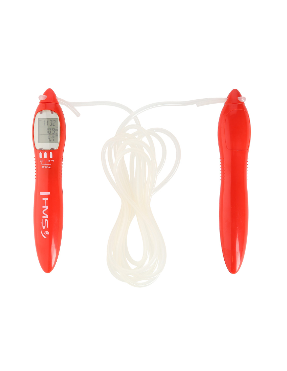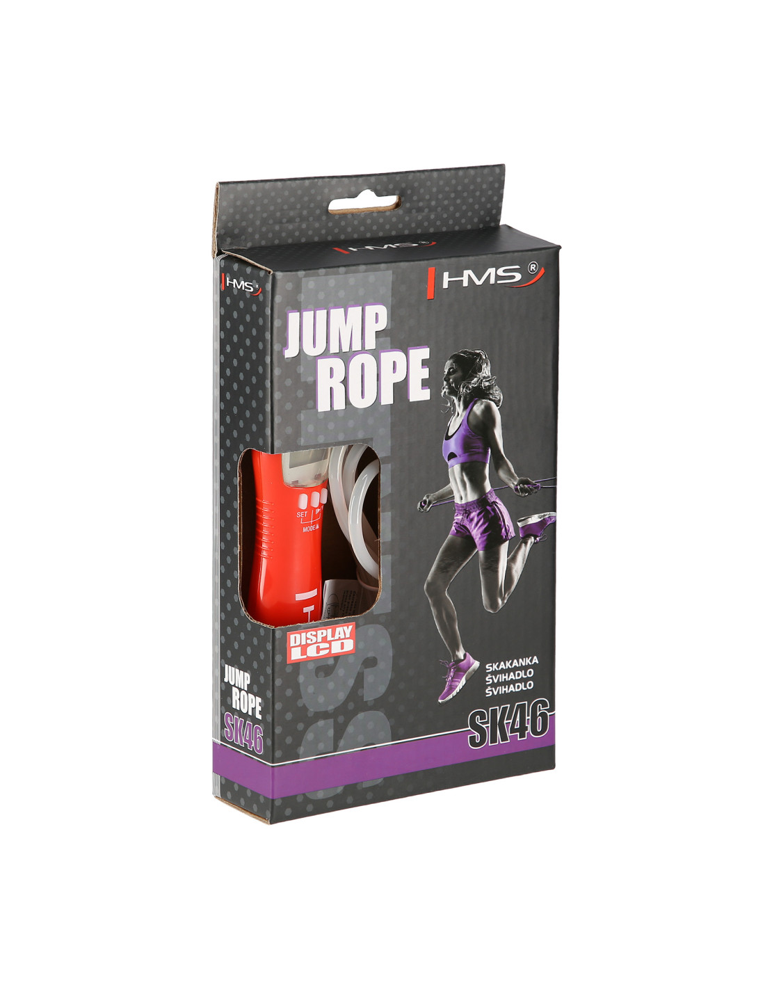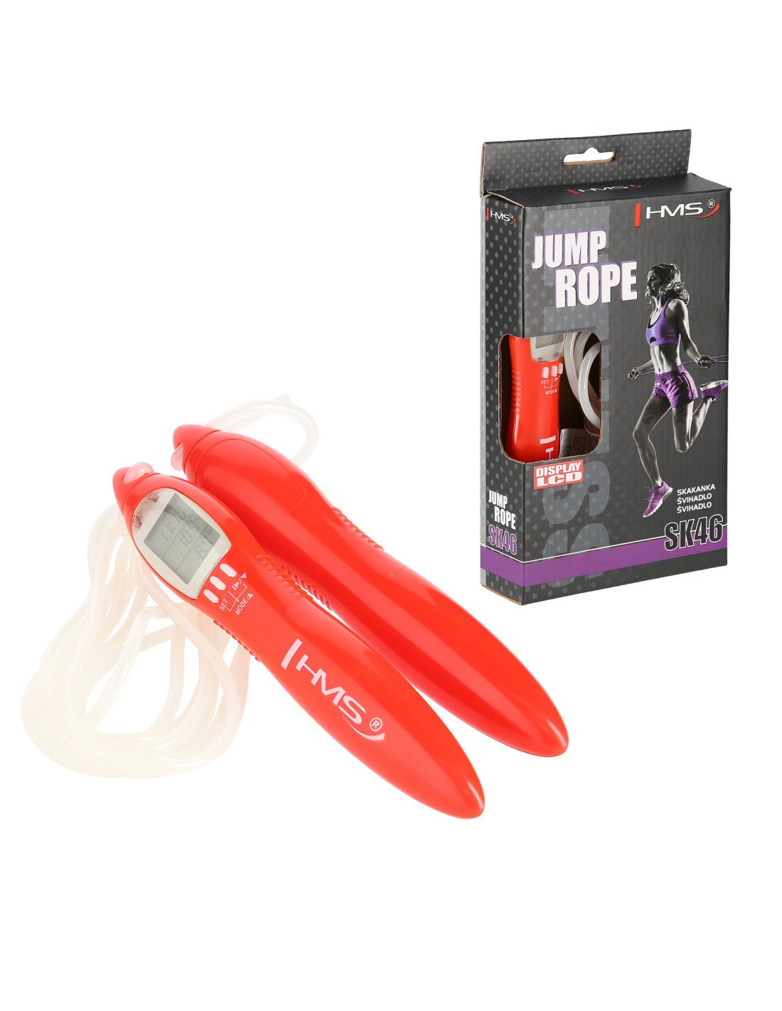 Въжето за скачане SK46 HMS е въже за скачане с гумена корда и две пластмасови дръжки. Продуктът е оборудван и с електронен брояч с LCD екран, който предлага три функции: консумация на калории, разстояние и брой повторения.