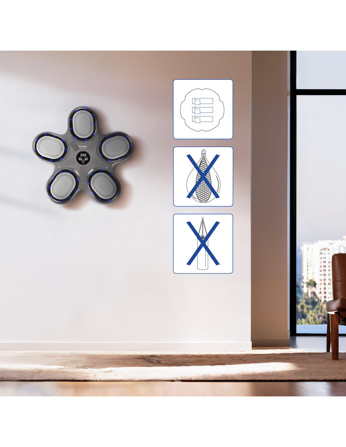 Боксовата стена разполага с опростена форма на измерване – броят на ударите се показва на екрана, което позволява на потребителя да следи напредъка си и да се мотивира за по-нататъшно подобряване. Липсата на ненужни функции прави устройството лесно за използване и идеално за всеки, който иска да се съсредоточи върху чиста, ефективна тренировка.