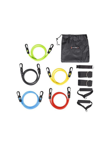 Тренировъчните ластици използват вашето телесно тегло, за да подобрят вашата физическа форма и сила. Високо качество, усъвършенствана конструкция и здравина гарантират успешни тренировки при всякакви условия. Комплектът включва пет съпротивителни ленти, две дръжки, две ленти за глезена и приставка за врата.