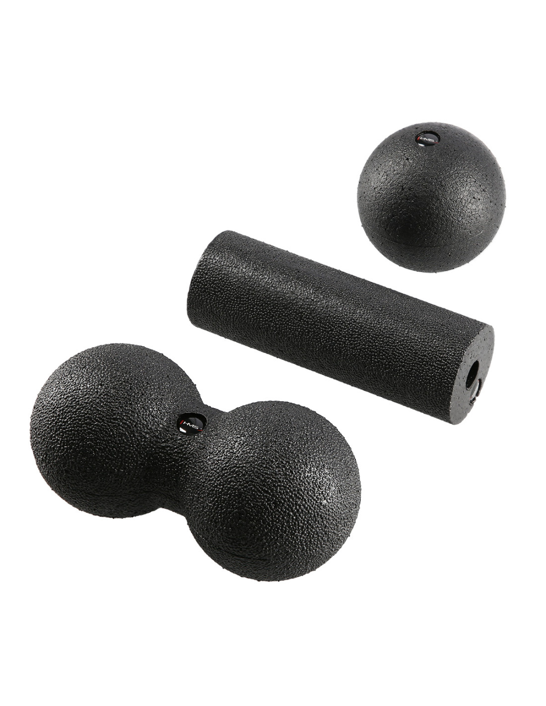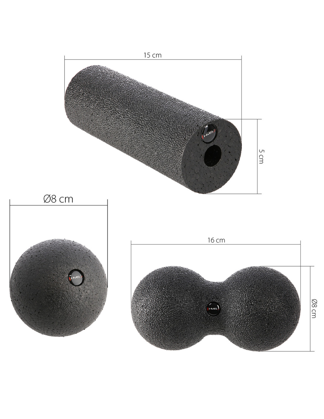 Малката топка, с диаметър 8 см, е идеална за масажиране на тригерни точки и зони на фасциално напрежение. Двойната топка HMS е перфектна за третиране на дълбоки мускулни групи или труднодостъпни зони като врата, седалището, раменете и гърдите. Мини ролката може да се използва за отпускане на предмишниците или стъпалата.