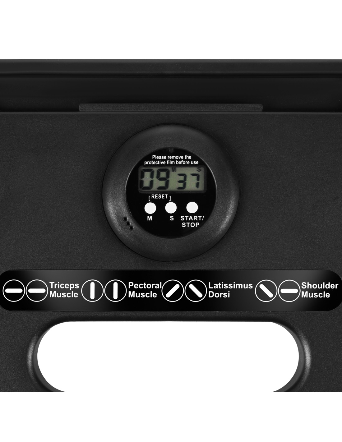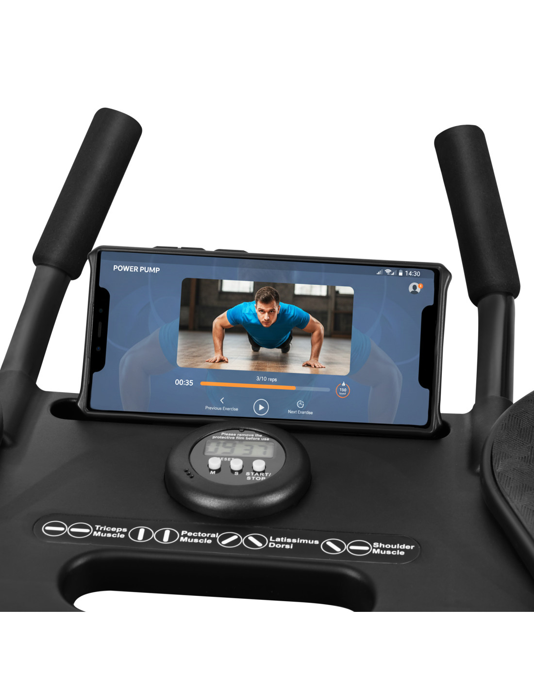 Вграденият таймер (мин/сек) улеснява интервалните тренировки. Държачът за смартфон ви позволява да виждате приложенията за тренировки или видео уроците – всичко това, без да е необходимо да държите устройството.