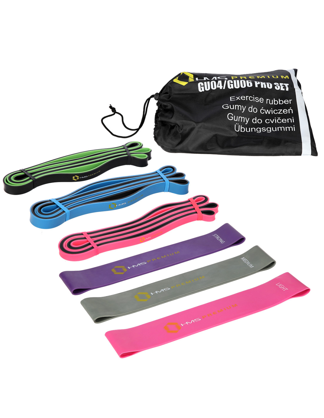 GU04 - GU06 PRO SET HMS PREMIUM е комплект от специализирани ластици, предназначени за използване в състезателни спортове, по-специално в двигателни тренировки. Основното предимство на този продукт е неговата издръжливост, която се осигурява от високото качество на материала, използван при изработката му.