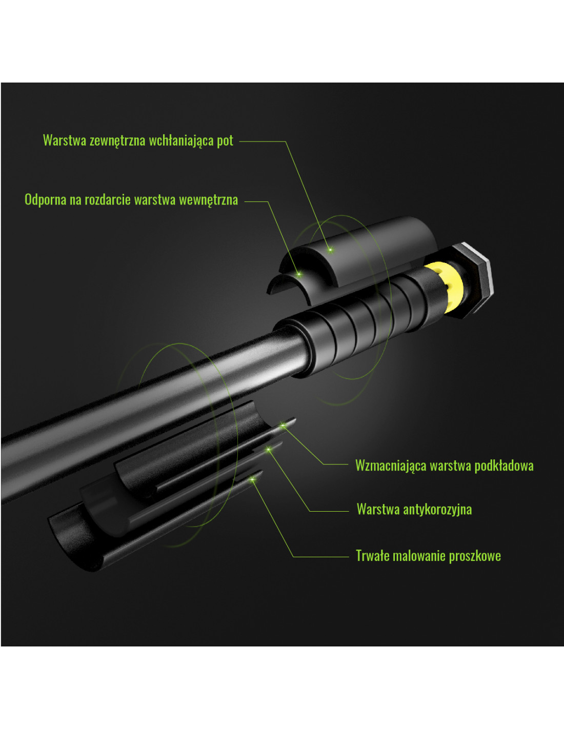 Лостът за набирания предлага много предимства, които подпомагат тренировката и осигуряват безопасност. Здравите силиконови подложки гарантират, че лентата за издърпване остава на място, докато заключващият механизъм предотвратява завъртането й. Дръжките са покрити със специален материал, който абсорбира потта и предпазва ръцете от изплъзване. Този продукт също така е устойчив на надраскване благодарение на устойчивия на корозия основен слой и прахово боядисаното покритие.