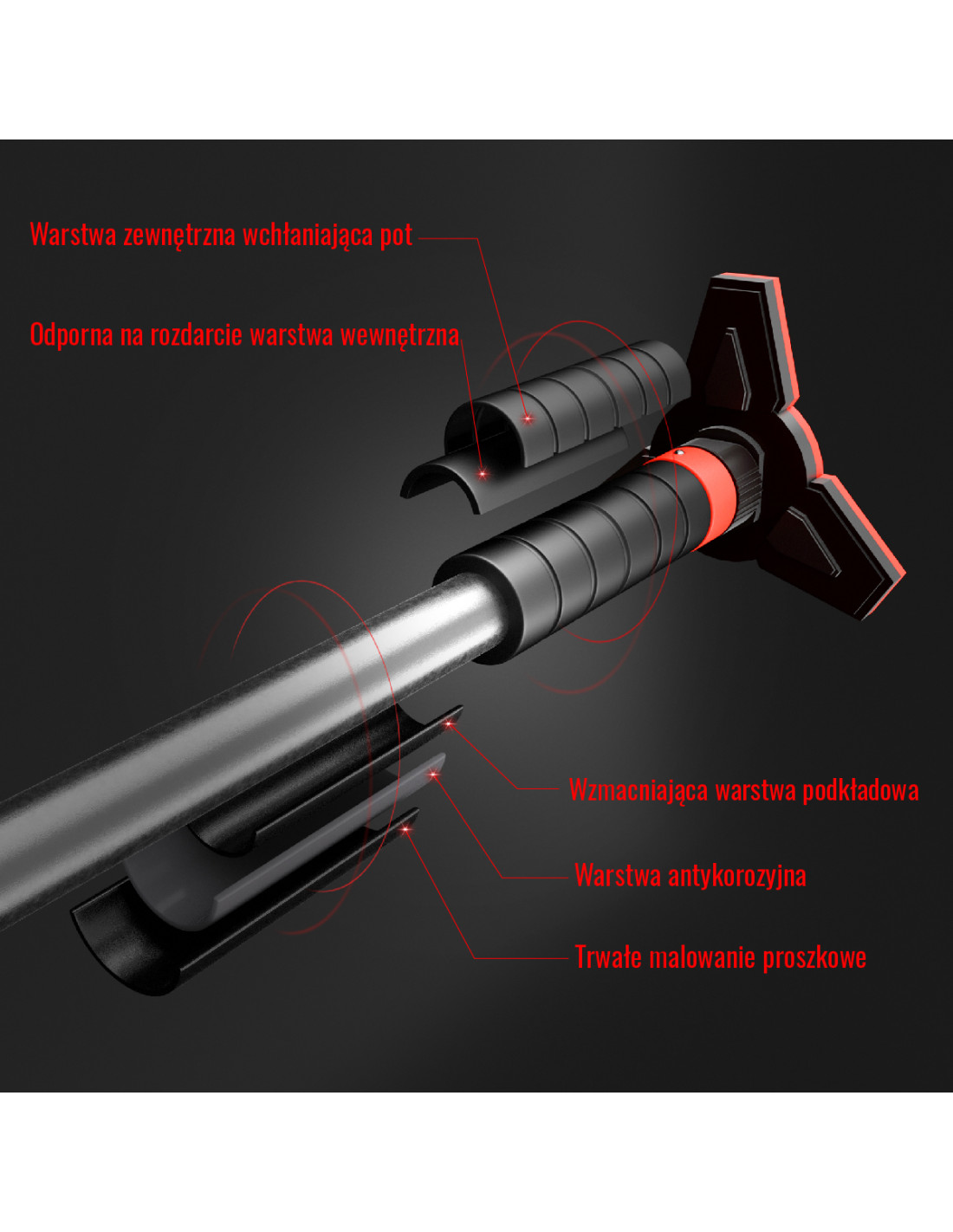 Дръжките са покрити със специален материал, който абсорбира потта и предотвратява плъзгането на ръцете. Освен това продуктът е устойчив на надраскване благодарение на основното покритие, защитата от корозия и трайното прахово покритие.