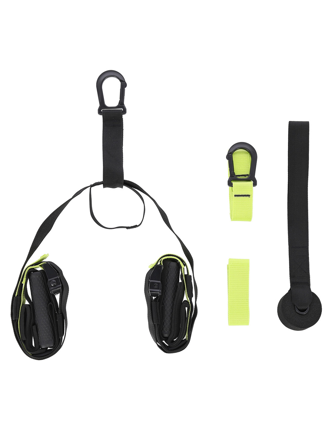 Този комплект се състои от ластици за упражнения с дръжки в краищата, метална карабина и приставка за врата. Дръжките са покрити с материал, който предпазва ръцете ви от изплъзване по време на тренировка.