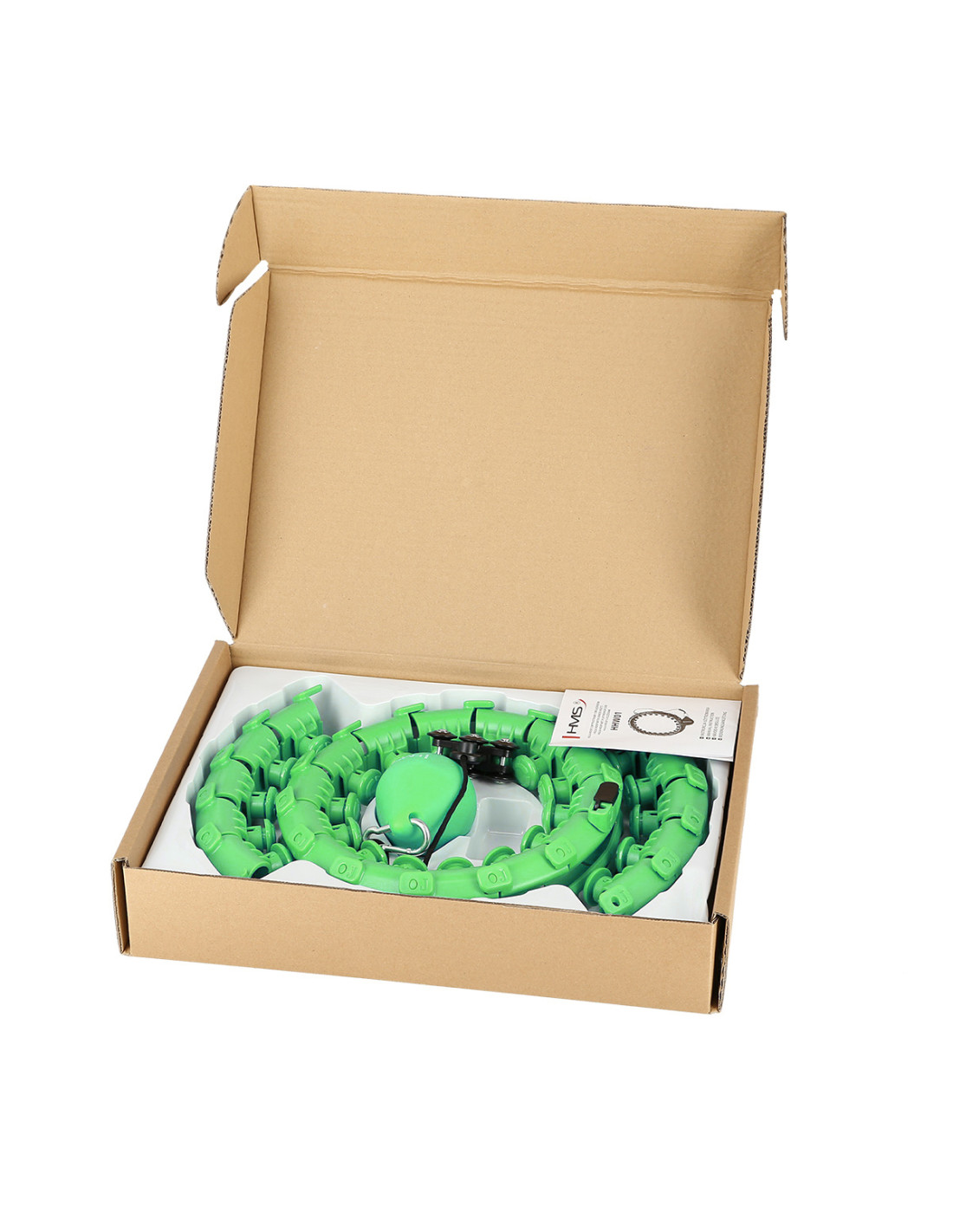 Man kann schnell und bequem die Größe des Reifens verkleinern oder vergrößern. Es reicht nur Elemente entsprechend den Bedürfnissen zu entfernen oder hinzuzufügen. HHW01 besitzt insgesamt 24 Elemente. Die Größe kann man zwischen 14 und 24 Elementen einstellen. Der Taillenumfang kann dementsprechend von 48 cm bis zum 106,5 cm betragen.