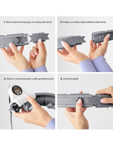 Die Montage erfolgt mit dem Knopfdruck der Clip-Verschlüsse. Es reicht einen Clip-Verschluss zu drücken, um Elemente zu entfernen oder hinzuzufügen. Man schiebt danach die Schiene mit dem Schwerkraftball, schließt die Clip-Verschlüsse und passt die Seillänge an. Fertig. Es ist wichtig, dass man das Element zum Speichern der Daten nicht herausnimmt.