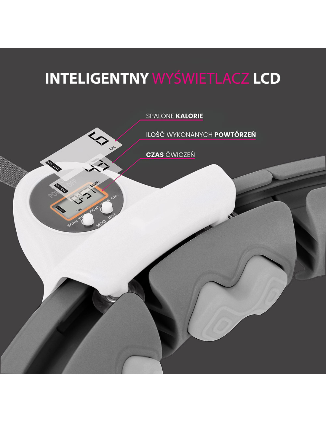 Man kann schnell und bequem die Größe des Reifens verkleinern oder vergrößern. Es reicht nur, Elemente entsprechend den Bedürfnissen zu entfernen oder hinzuzufügen. Die Größe kann man zwischen 12 und 16 Elementen einstellen. Der Taillenumfang kann dementsprechend von 76 cm bis zum 109 cm betragen (Durchmesser des Kreises: 34 - 45 cm).