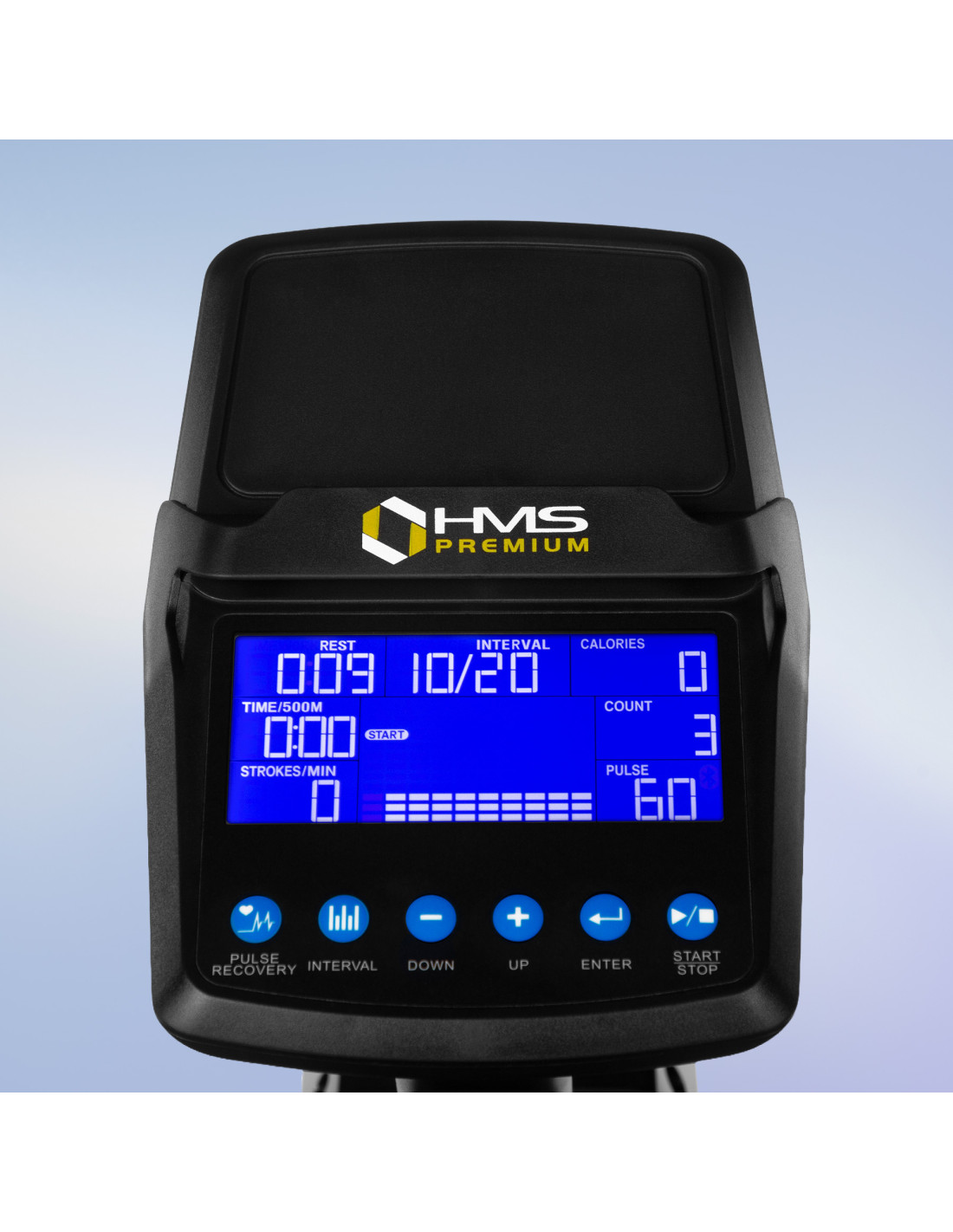 ZM1856 HMS Premium е усъвършенстван гребeн тренажор от търговски клас, предназначен за интензивна употреба във фитнес зали, студиа за лични тренировки и взискателни домашни фитнес зали. Здравата му конструкция, модерната електроника и съвместимостта с приложението Kinomap го правят универсално устройство за тренировка на цялото тяло.