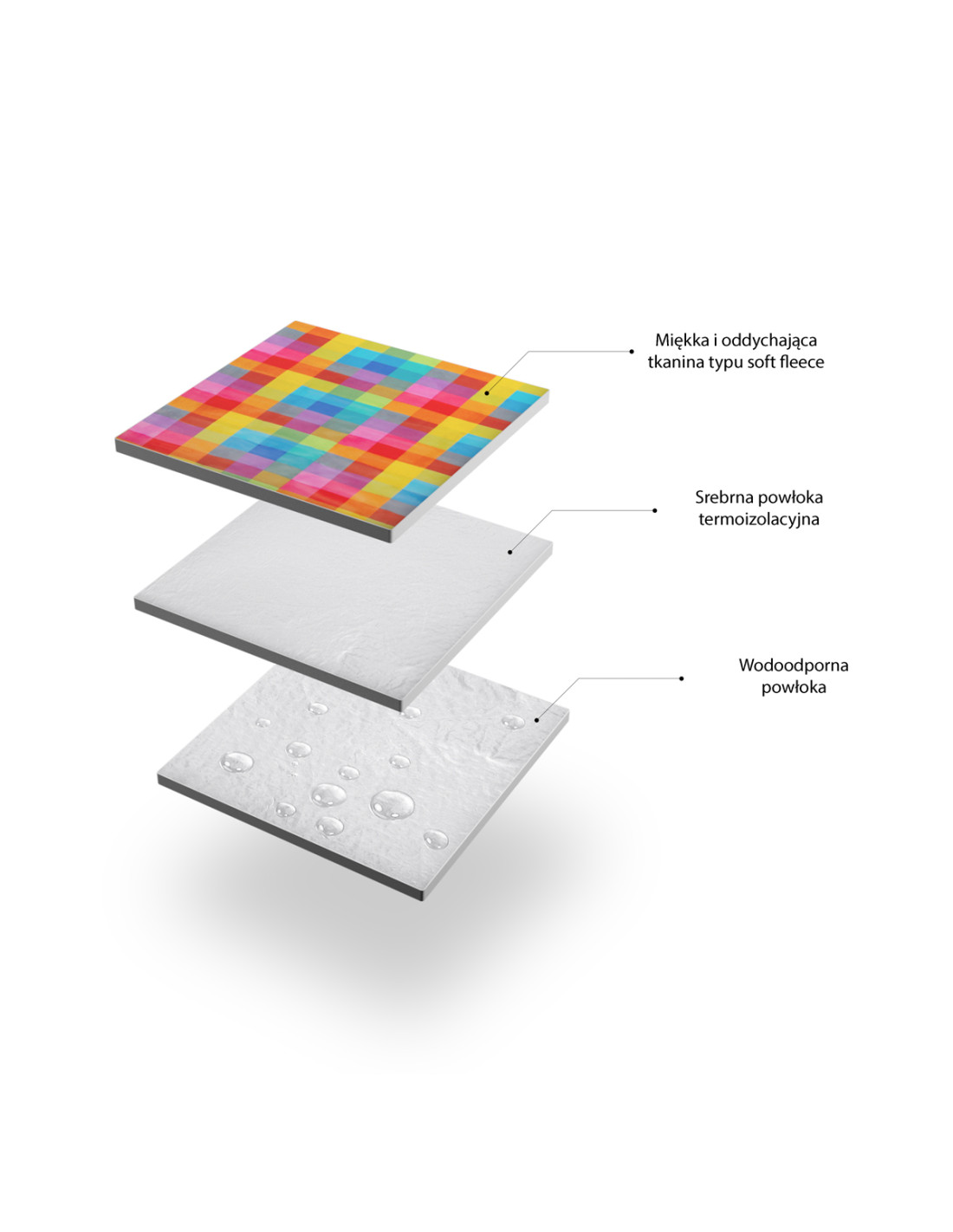 Одеялото се състои от два слоя материал. Горният слой е удобна и мека пяна, характеризираща се със своята мекота и защита от студената земя. Това естествено подобрява комфорта на потребителя. Долният слой е водоустойчив алуминиев слой, позволяващ одеялото да се използва върху влажен пясък или покрита с роса трева, например. Тези два материала образуват отличен топлоизолационен слой.