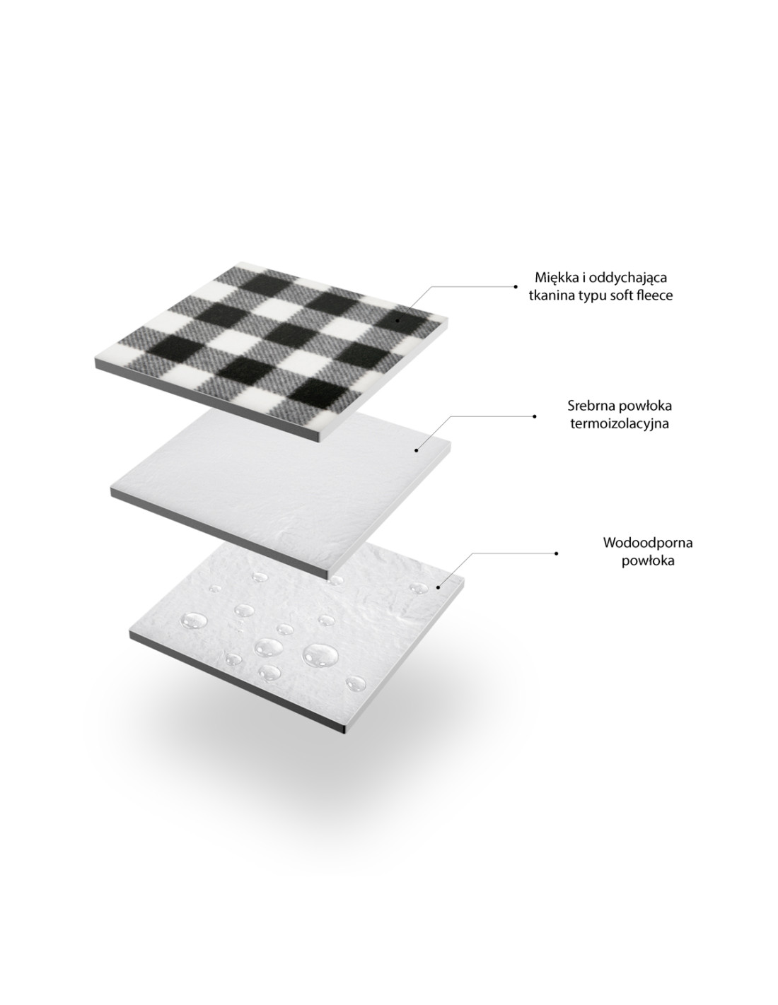Одеялото се състои от два слоя материал. Горният слой е удобна и мека пяна, характеризираща се със своята мекота и защита от студената земя. Това естествено подобрява комфорта на потребителя. Долният слой е водоустойчив алуминиев слой, позволяващ одеялото да се използва върху влажен пясък или покрита с роса трева, например. Тези два материала образуват отличен топлоизолационен слой.