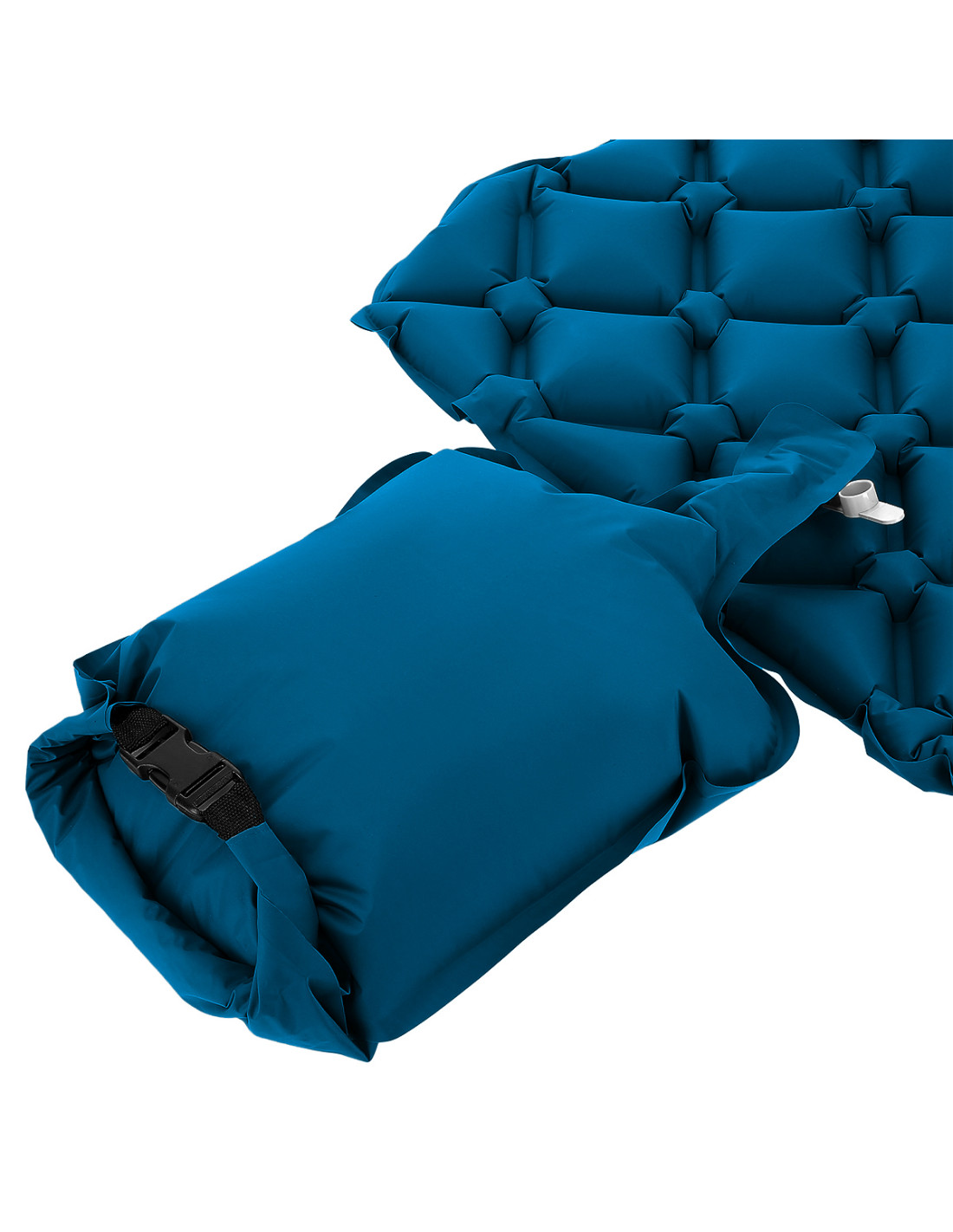 Навитата постелка спестява много място, а методът за навиване е много прост. Развийте вентила и навийте постелката, като започнете отгоре. Не е нужно да се притеснявате, че ще се разгъне сам, тъй като има каишка със закопчалки. Комплектът включва и практичен защитен калъф, в който може да се опакова нашата постелка. Това значително ще улесни транспортирането и допълнително ще предпази постелката от повреда. Всичко това, съчетано с теглото на постелката от само 0,5 кг, ви позволява да я вземете със себе си на всяко пътуване.